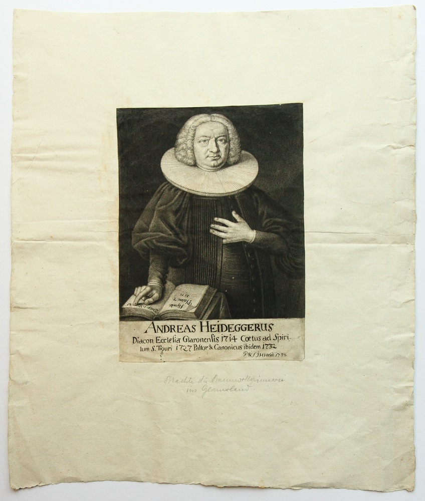 • Inscription: Below the depiction in the printing plate with the Latinised name of the sitter as well as his most important clerical offices. Below signed by the artist “P&SJHHeid” and dated 1739.