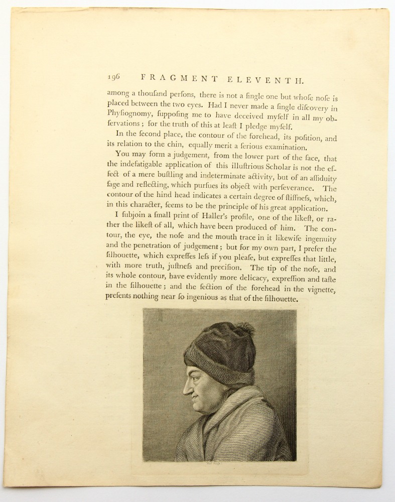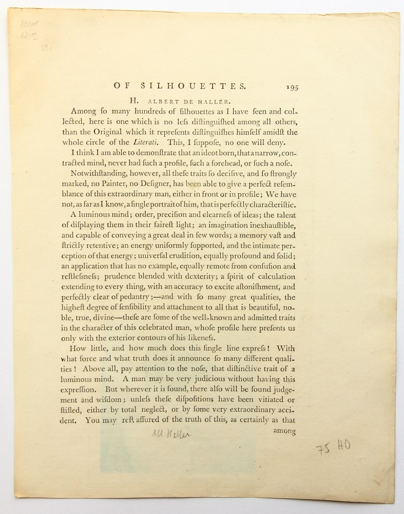 - Description: Portrait of the physician Albrecht von Haller in profile. Copper engraving on strong paper. The image is an illustration in a text printed on both sides of the sheet “Of Silhouettes – H. Albert de Haller”.