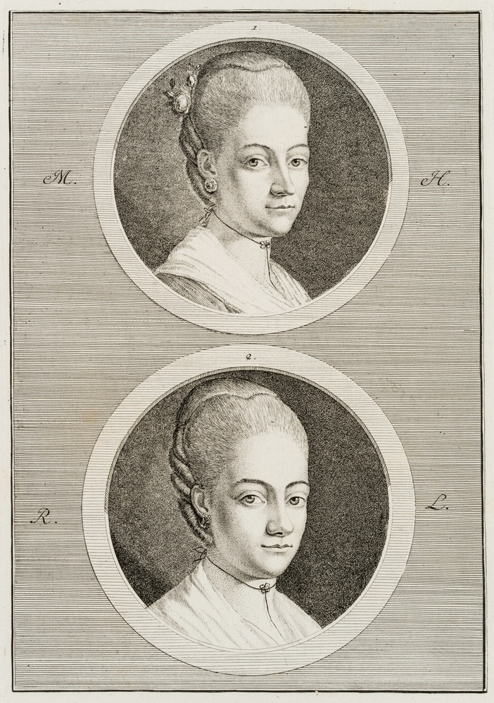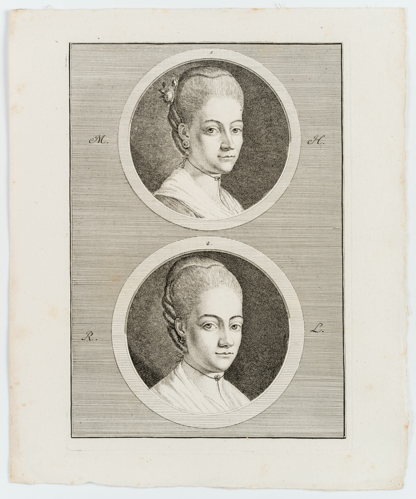 - Beschreibung: Zwei Büstenporträts im Halbprofil im jeweils eigenen Medaillon. Seitlich in der Druckplatte jeweils mit den Initialen der Dargestellten bezeichnet: “M. H.” und “R. L.”. Das Blatt stammt aus Johann Caspar Lavaters Physiognomische Fragmente, zur Beförderung der Menschenkenntniß und Menschenliebe. Zwischen 1775 und 1778 gab er das mehrbändige Werk heraus, in dem menschliche Charaktere anhand ihrer Physiognomie erklärt werden. Bekannte Künstler wie Daniel Chodowiecki, Johann Rudolph Schellenberg oder Johann Heinrich Lips lieferten Vorlagen für seine Sammlung der Physiognomik, die zahlreiche Porträts bekannter und anonymer Personen enthält. Beachten Sie dazu auch unser weiteres Angebot.