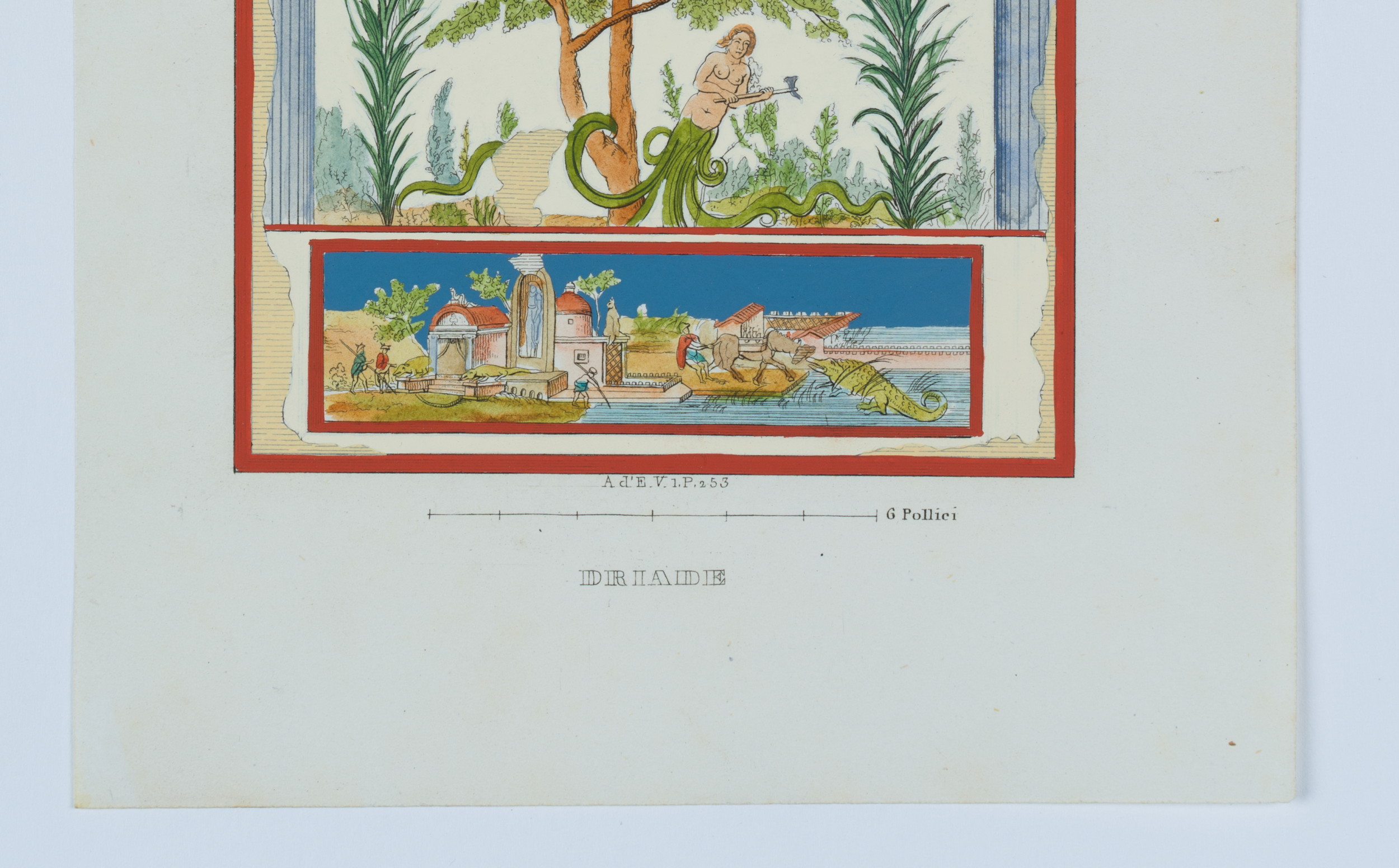 - Beschreibung: Unter der Waldlandschaft ist eine kleinere Graphik einer Uferlandschaft mit Krokodilen zu sehen. Stiche nach den Fresken aus den Grabungsstätten um Neapel, Herculaneum und Pompeji.