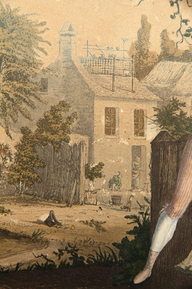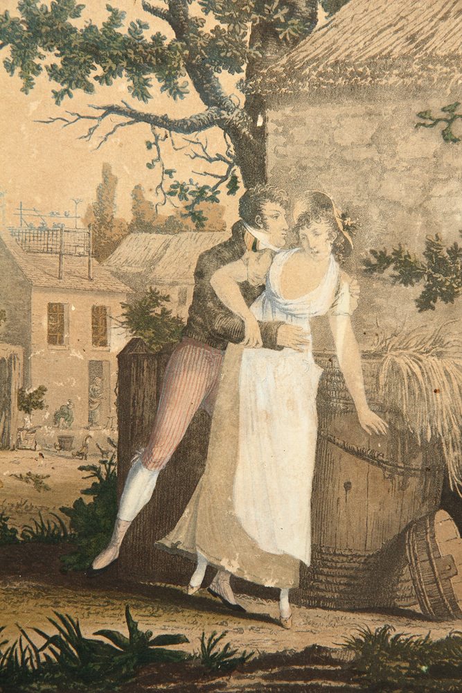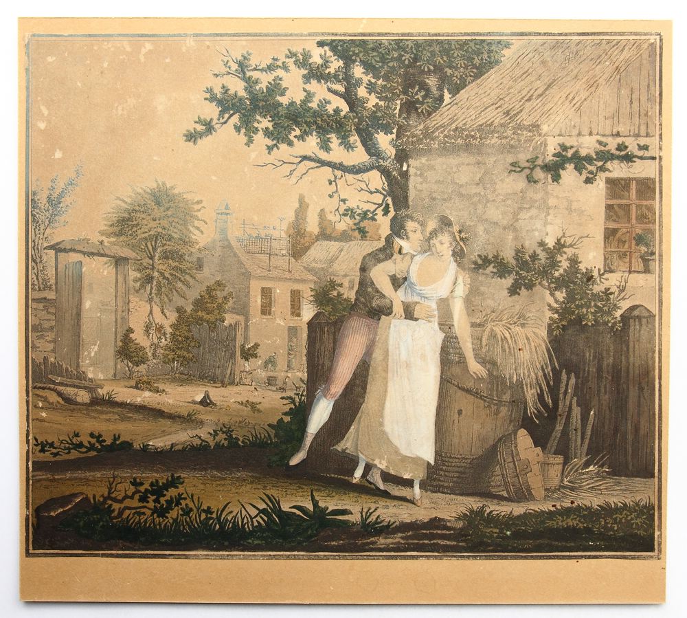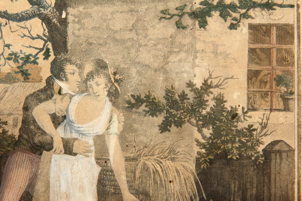 • Beschreibung: Darstellung im Stil einer romantischen Romanillustration etwa im Umkreis von Jane Austen (1775-1817). Der aufdringliche junge Mann, die jungen Dame mit Sommerkleid und Hut sowie die Gebäude der Umgebung sind in ihrer Gestalt dem späten 18. Jahrhundert in England zuzuordnen.