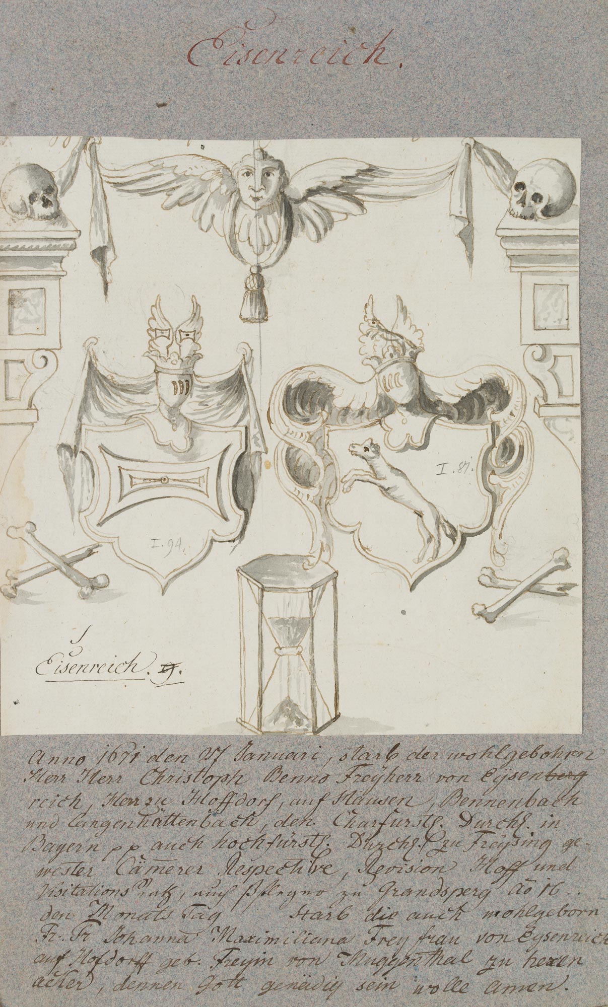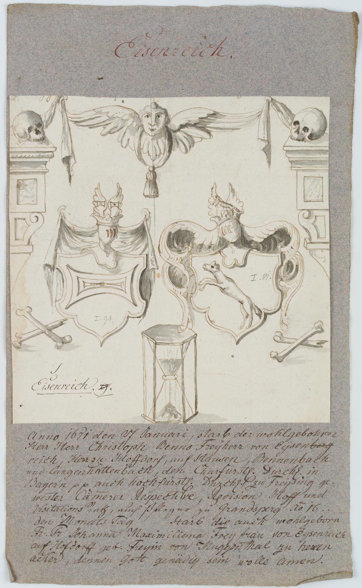 Unbekannt (18. Jahrhundert), Eisenreich Wappen, Heraldik, Familienwappen Grabstein, um 1700, Federzeichnung