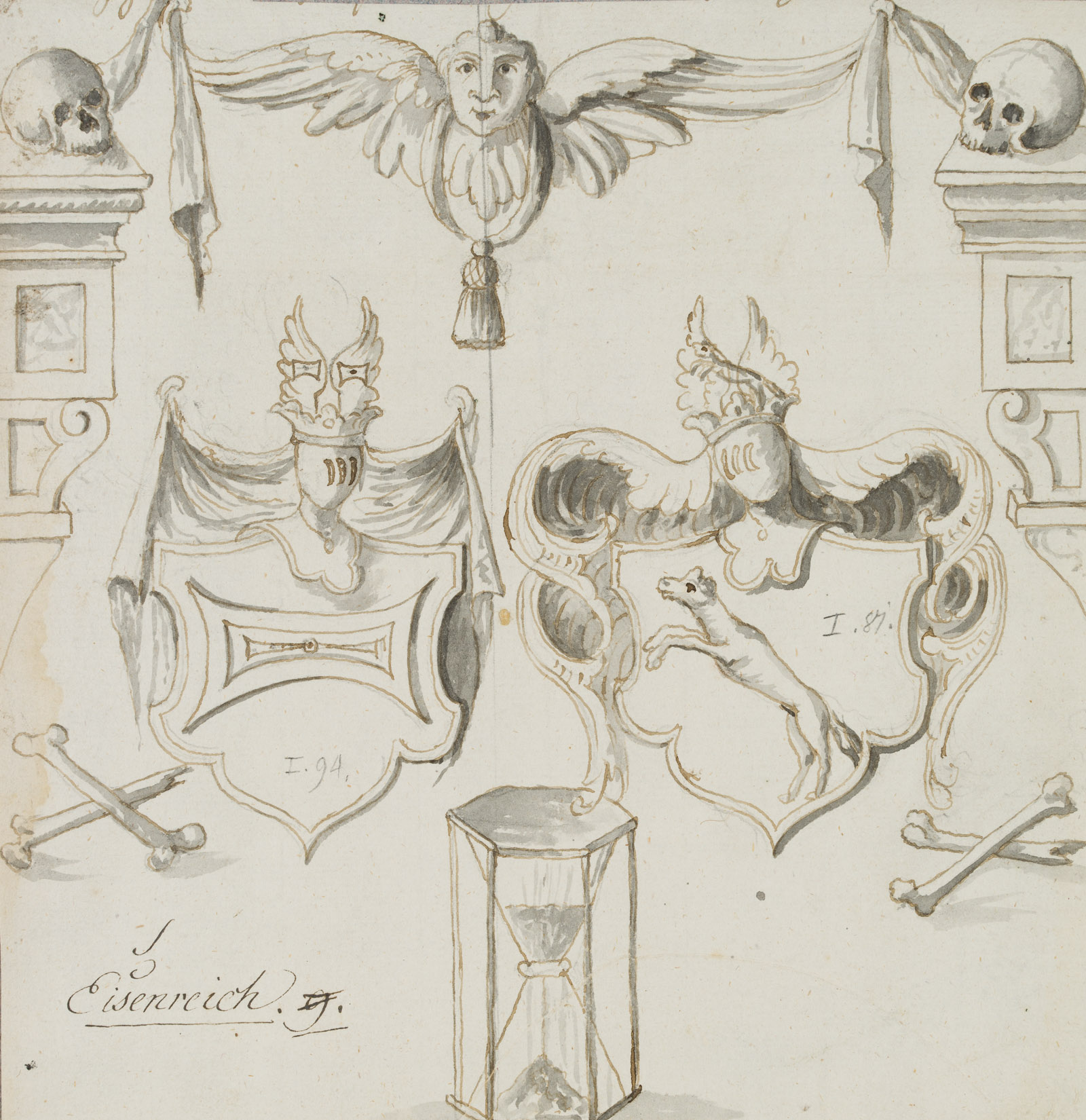 Unknown (18th century), Eisenreich coat of arms, heraldry, family coat of arms gravestone, c. 1700, Pen drawing