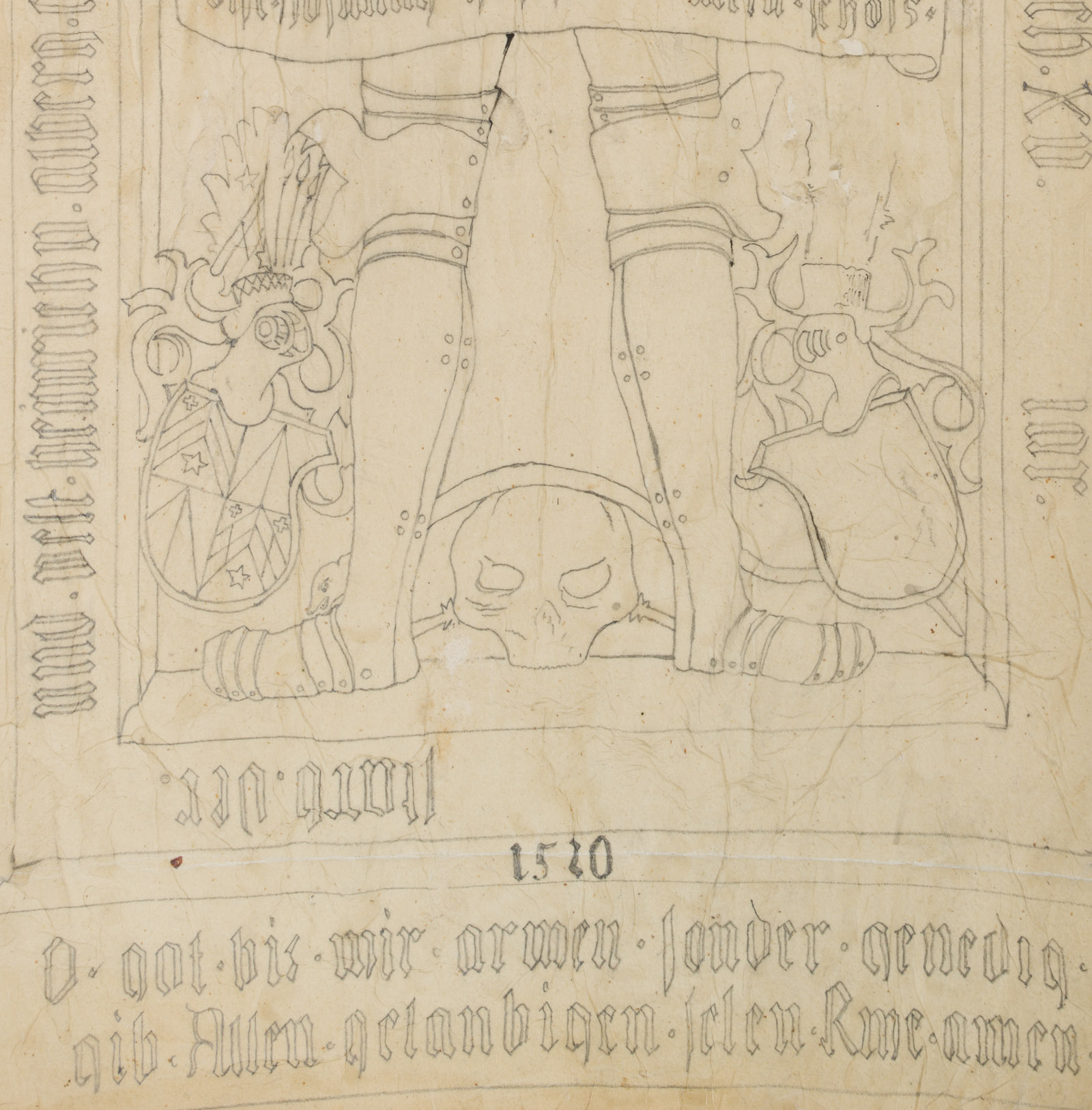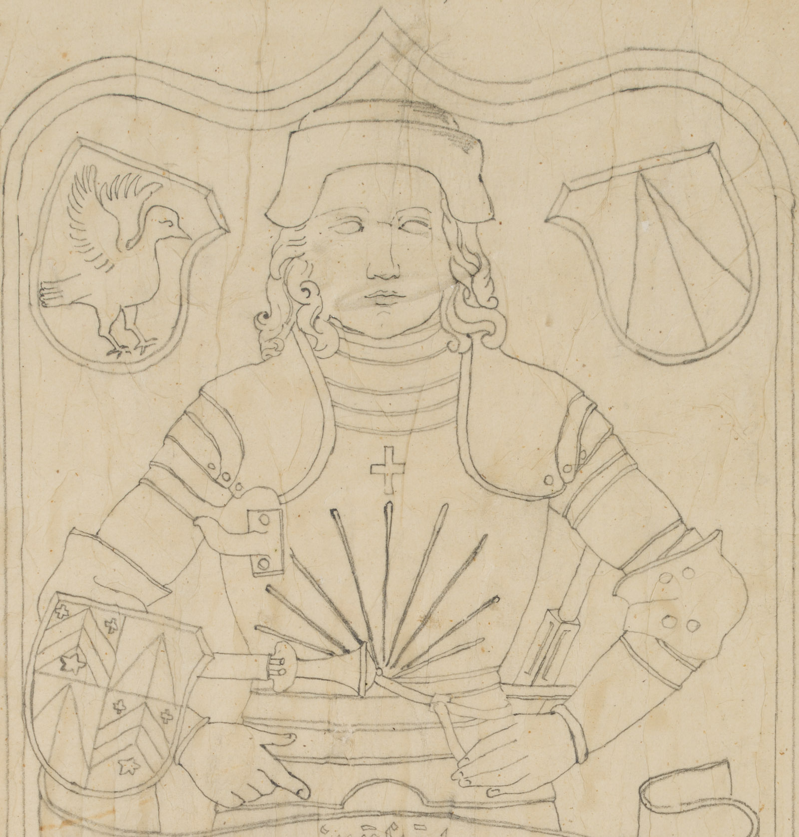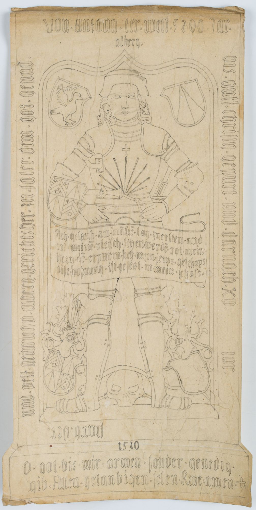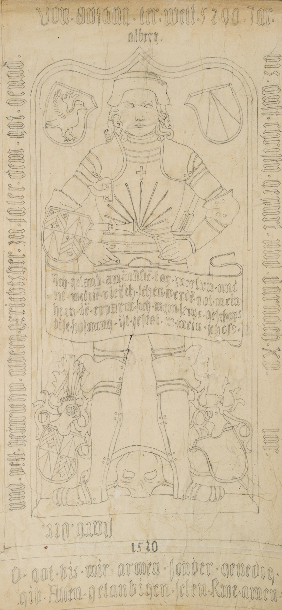 Unknown (18th century), Drawing after the epitaph of Heinrich von Alberg (d 1520) with coat of arms, lord of the court at Sala, heraldry, 18th century, Pencil
