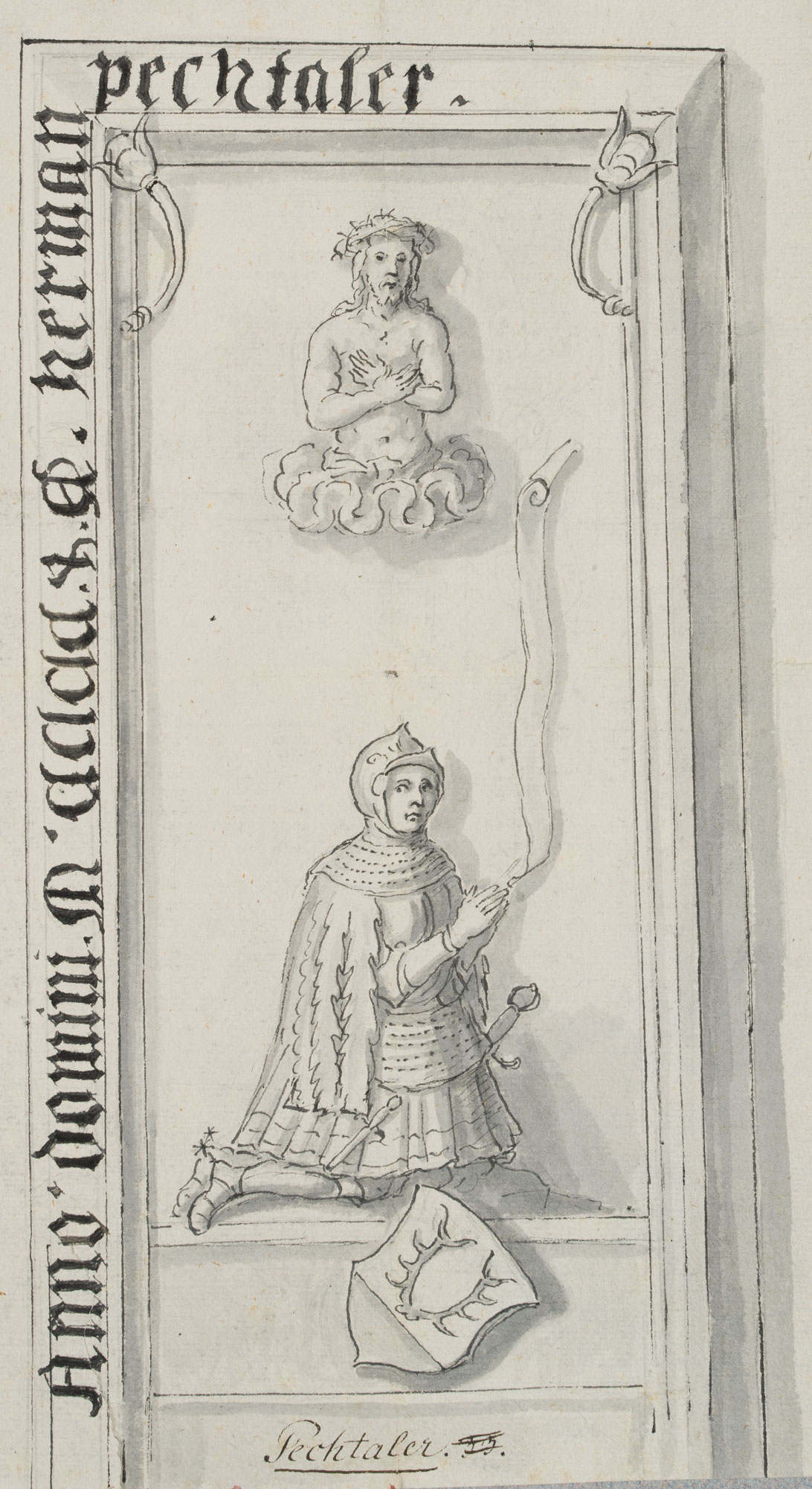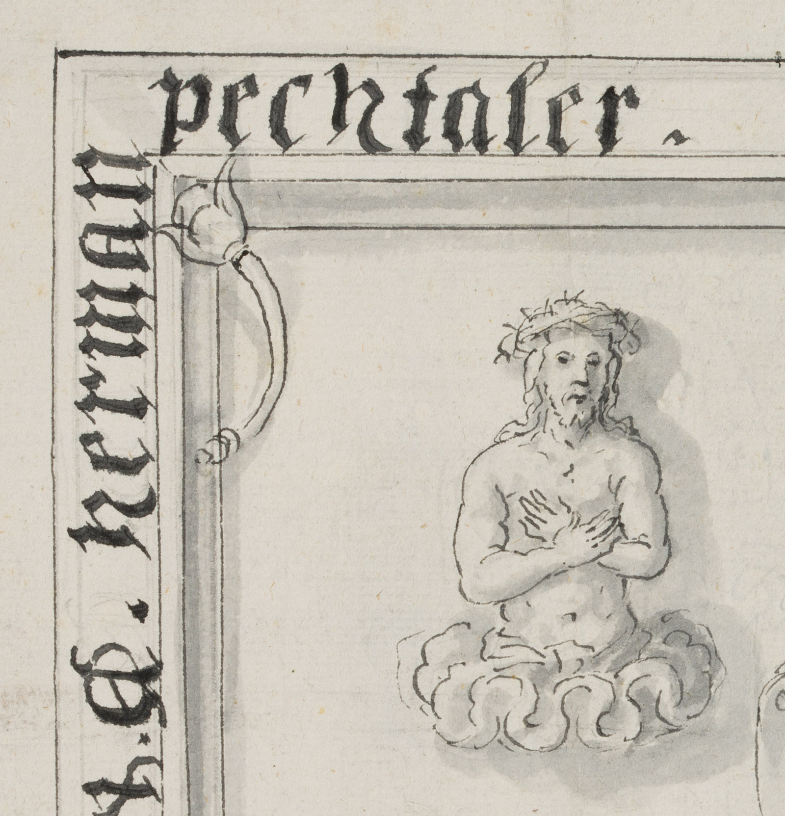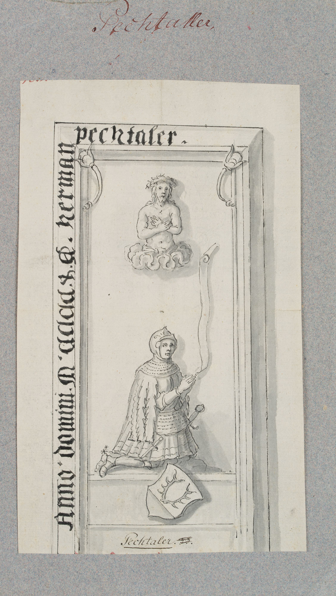 - Bezeichnung: Oben auf der Unterlage bezeichnet: “Pechtaler”, im Rahmen des Epitaphs bezeichnet “Herman Pechtaler”; verso handschriftlich bezeichnet von fremder Hand.