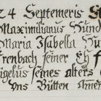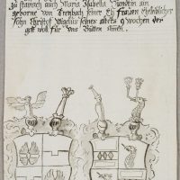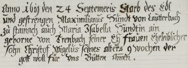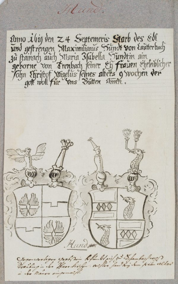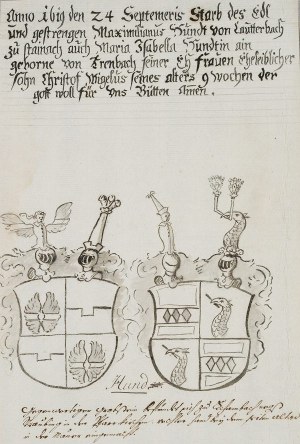 - Bezeichnung: Oben auf der Unterlage bezeichnet: „Hundt“, oben in der Darstellung ist die Inschrift des Epitaphs zu lesen: „Anno 1619 starb der edl und gestrenge Maximilianus Hundt von Lautterbach zu Stainach auch Maria Isabella Hundt geborene von Arenbach..Seiner Ehfrauen eheleiblicher Sohn Christoph Migelus seines alters 9 wochen der gott woll für uns bütten amen.“, unten schöne Zeichnung mit dem Stammwappen der Hundt zu Lautterbach.