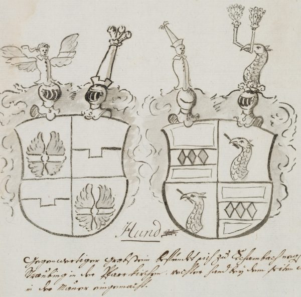 Unbekannt (18. Jahrhundert), Zeichnung nach dem Epitaph des Maximilianus Hundt von Lautterbach (gest. 1619) und der Maria Isabella Hundt, mit Stammwappen der Hundt zu Lautterbach, Wappen, Heraldik, um 1700, Federzeichnung