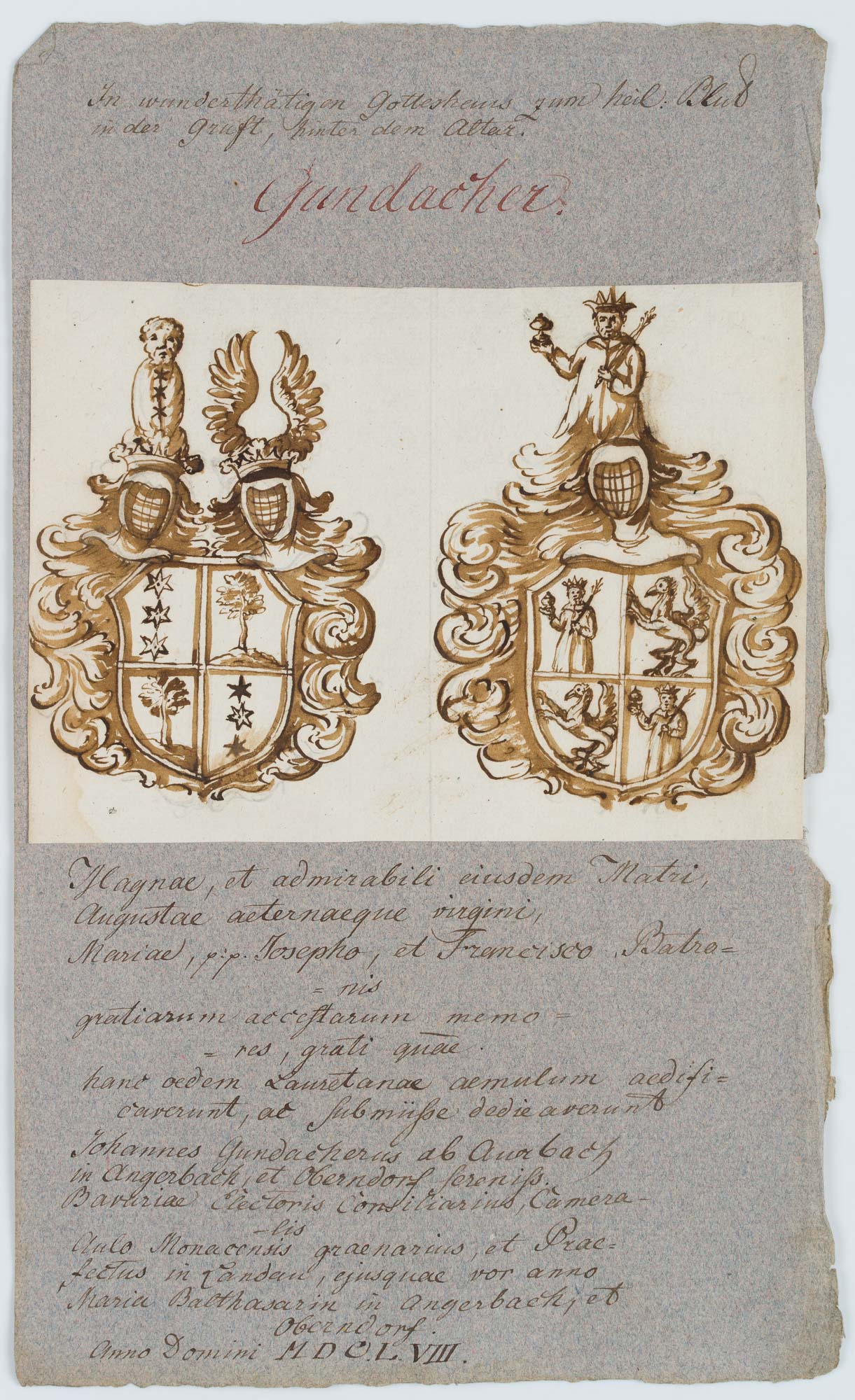 - Inscription: Inscribed “Gundacher” at the top of the backing and with location: “In the miraculous church of the Holy Blood in the crypt behind the altar”. Blut in the crypt behind the altar”. At the bottom of the document with the inscription: “…Anno Domini MDCL VIII.