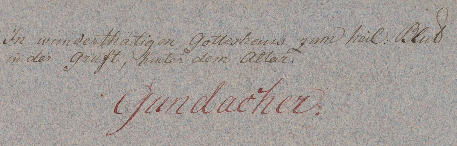 - Bezeichnung: Oben auf der Unterlage bezeichnet “Gundacher” und mit Ortsangabe: “In wunderthätigen Gotteshaus zum heil. Blut in der Gruft, hinter dem Altar.”. Unten auf der Unterlage mit Inschrift: “…Anno Domini MDCL VIII.”