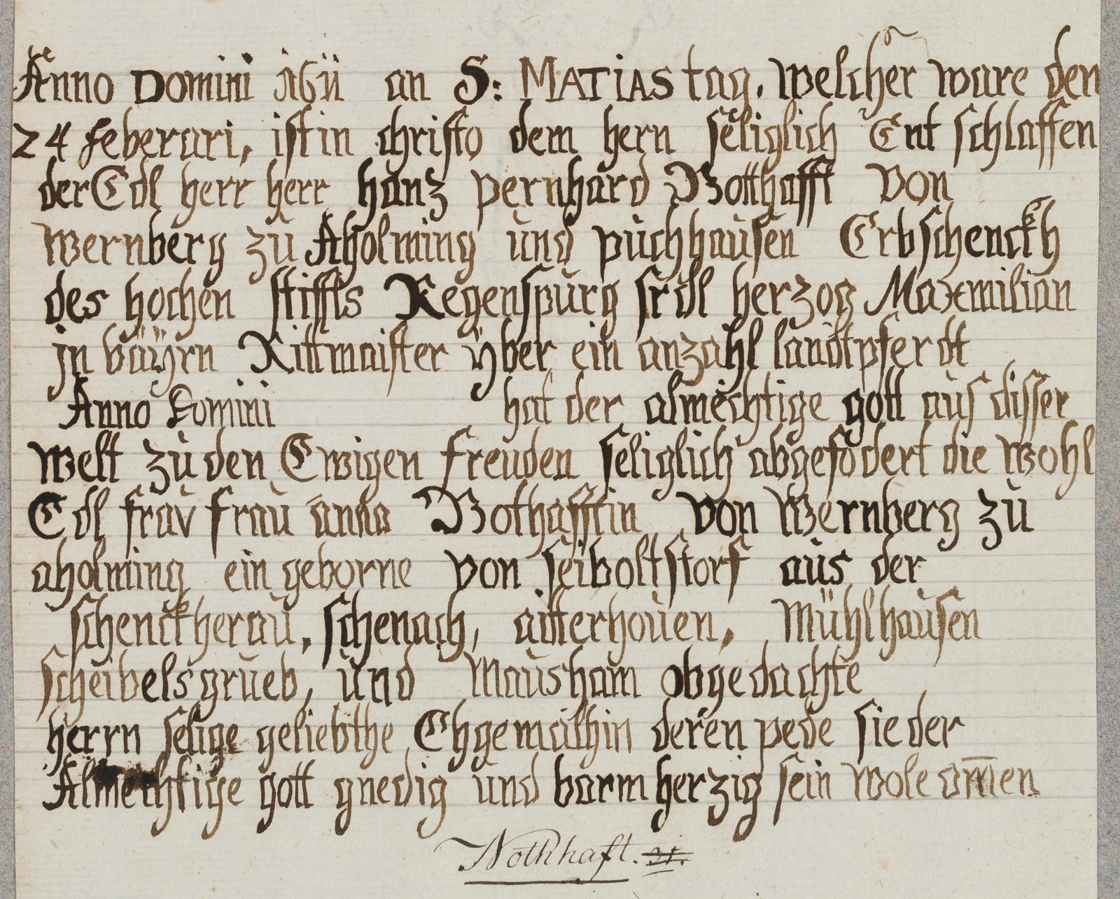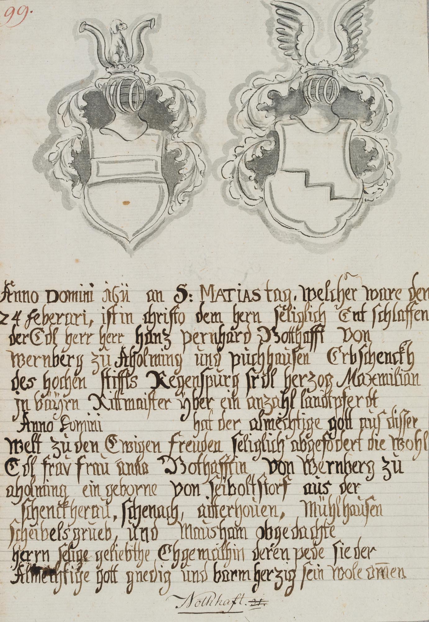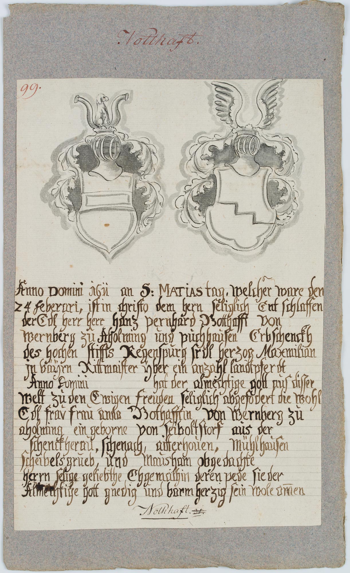 • Bezeichnung: Oben auf der Unterlage bezeichnet: “Notthafft”, Darstellung oben mit dem Notthafft-Wappen (links) sowie dem Stammwappen derer von Seiboldsdorf (rechts) unten mit Inschrift: “Anno Domini 1611 an S. Matias Tag, welcher ware den 24 Feberari, ist in Christo dem Herrn seliglich entschlafen der Edl Herr Hans Bernhard Notthafft von Wernberg zu Aholming ..und Anna von Wernberg zu Aholming ein geborene von Seiboldsdorf aus Schönach..”; verso handschriftlich bezeichnet.