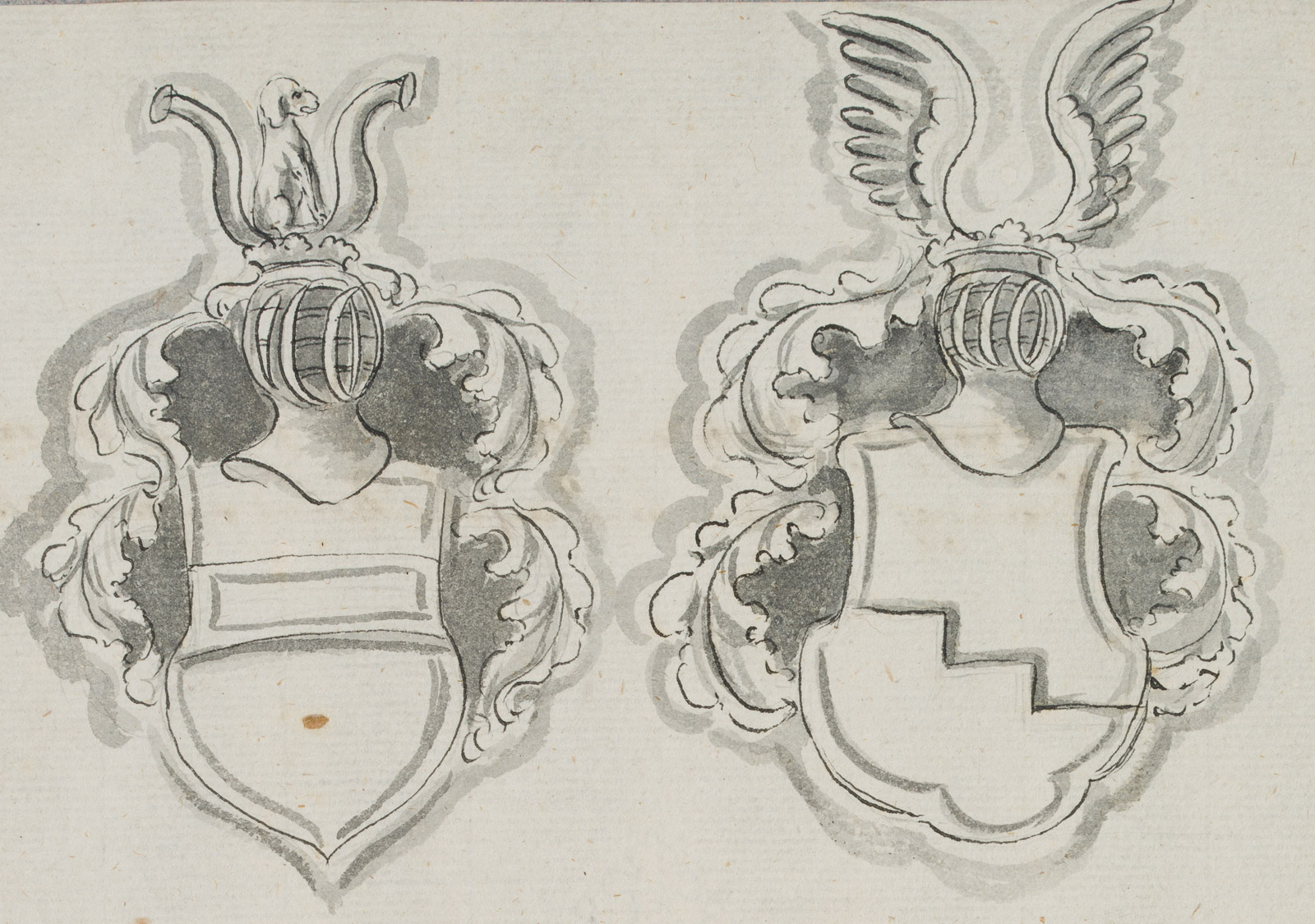Unknown (18th century), Drawing after the epitaph of Hans Bernhard NOTTHAFFT & his wife Anna née SEIBOLDSDORF, with epitaph, Notthafft, Bavarian noble family, coat of arms, heraldry, c. 1700, Pen drawing