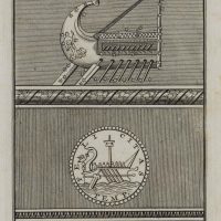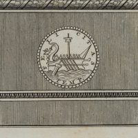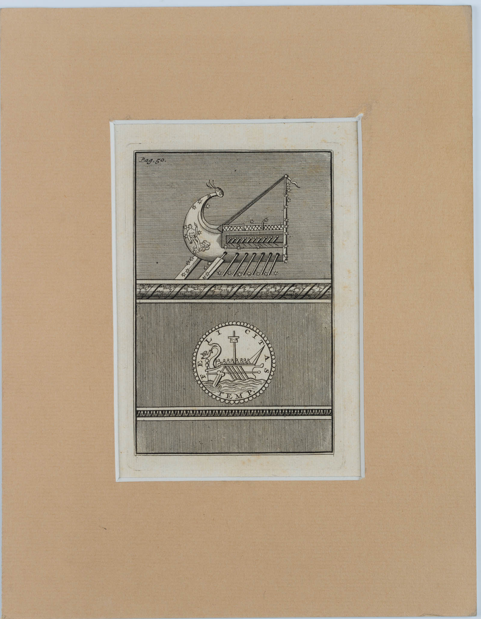 - Description: Without designation. Depiction of a galley in the upper register of the representation with a patron saint on the bow of the ship. In the lower register, separated by an ornamental frieze, an emblem, on which is to be read “Felicitas Temp.