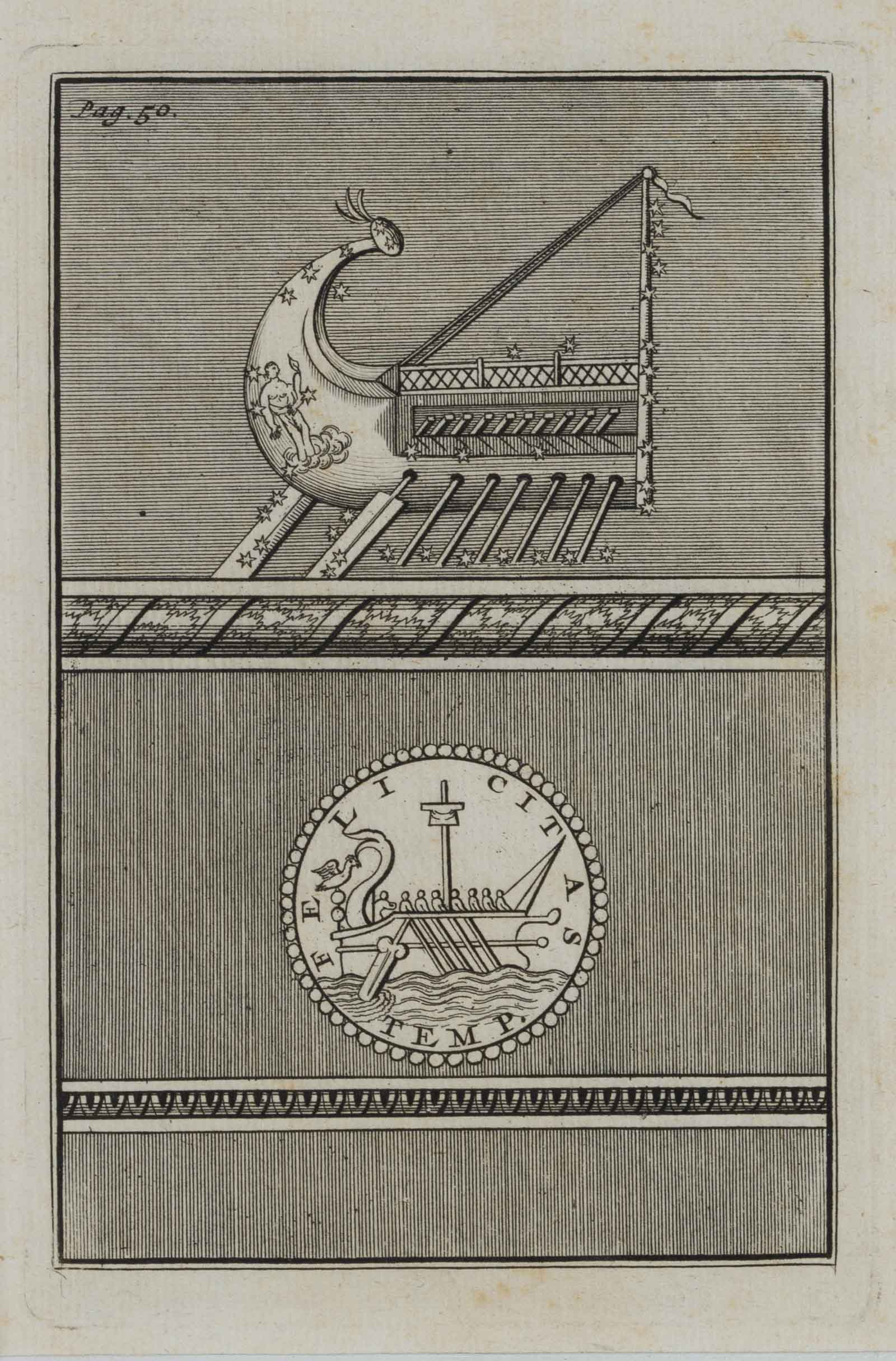 - Beschreibung: Ohne Bezeichnung. Darstellung einer Galeere im oberen Register der Darstellung mit einem Schutzpatron auf dem Bug des Schiffes. Im unteren Register, getrennt durch einen Zierfries, ein Emblem, darauf zu lesen “Felicitas Temp.”.