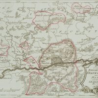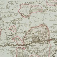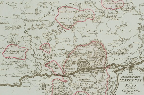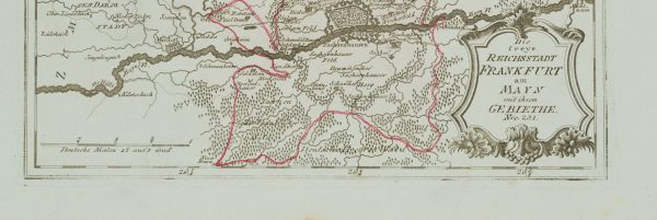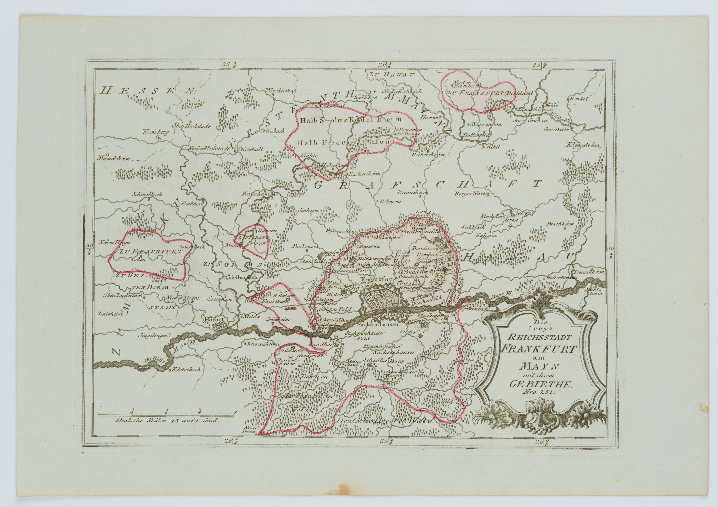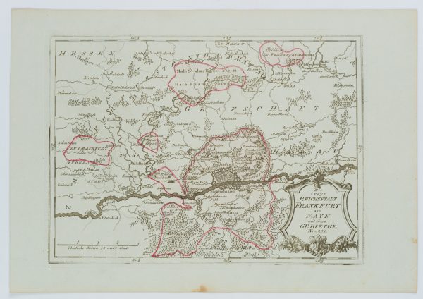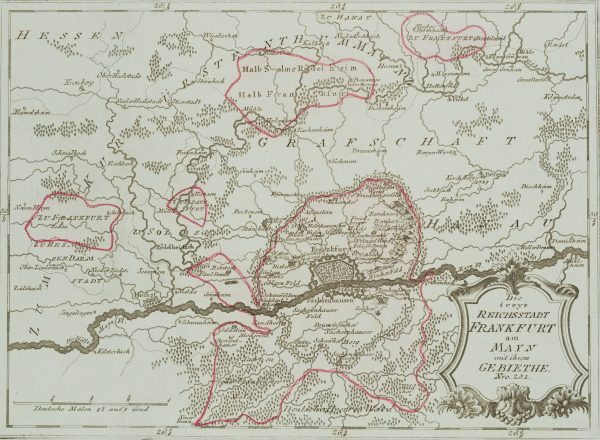 - Beschreibung: Karte von Frankfurt mit den zugehörigen Gebieten, rot markiert. Frankfurt wurde 1372 freie Reichsstadt im Heiligen Römischen Reich Deutscher Nation. Sie behielt ihre Selbständigkeit bis 1806, als sie durch Napoleon dem Fürstentum Aschaffenburg zugesprochen wurde und dann 1810 im Großherzogtum Frankfurt aufging. Rechts unten mit ornamentaler Rokoko-Kartusche