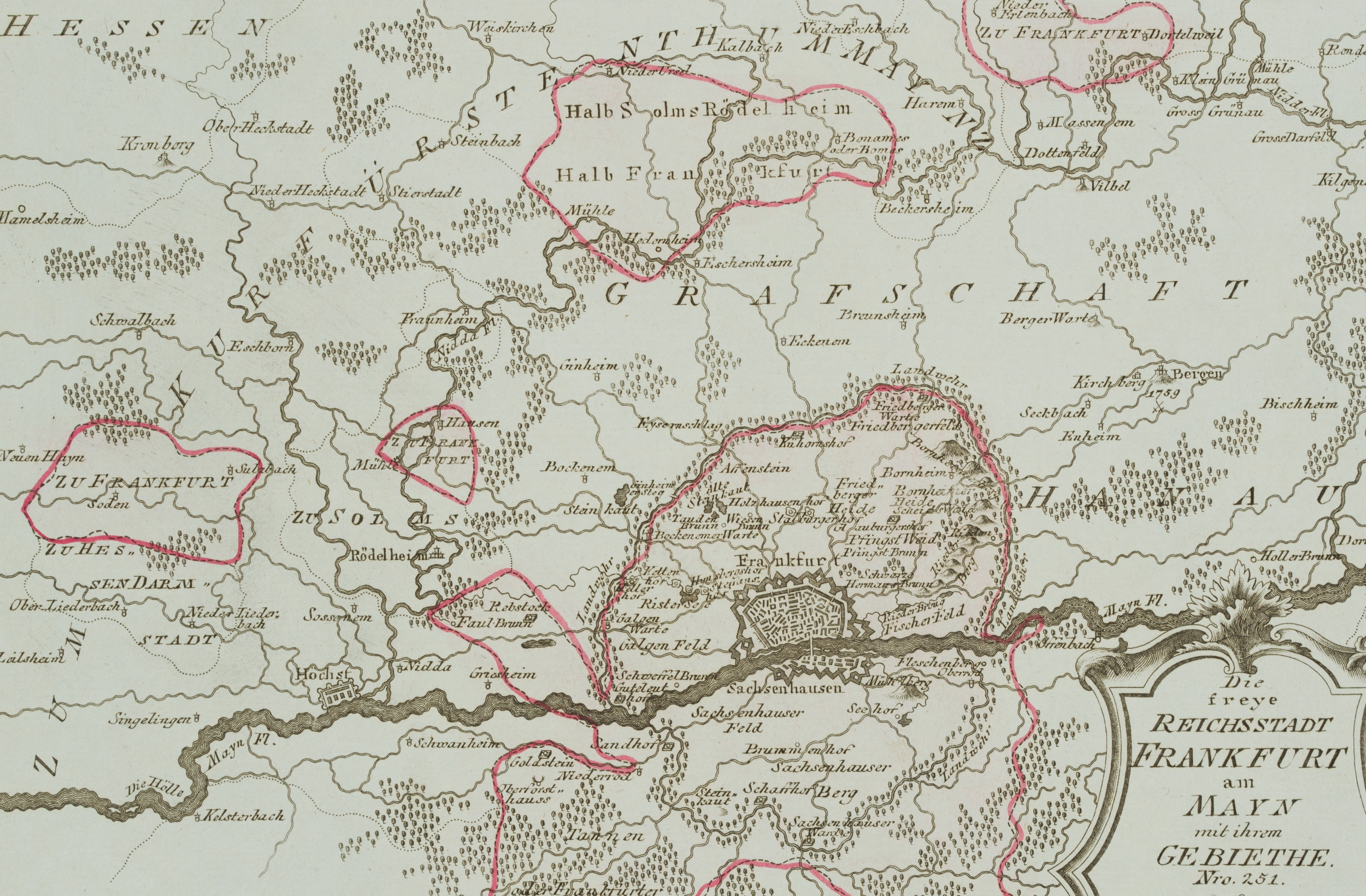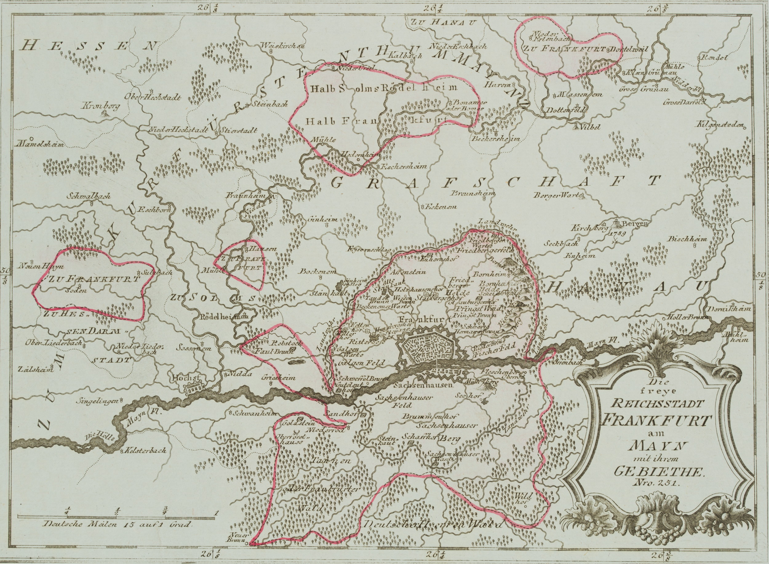 - Description: Map of Frankfurt with the associated territories, marked in red. Frankfurt became a free imperial city in the Holy Roman Empire of the German Nation in 1372. It retained its independence until 1806, when Napoleon assigned it to the Principality of Aschaffenburg and it was then absorbed into the Grand Duchy of Frankfurt in 1810. Lower right with ornamental rococo cartouche