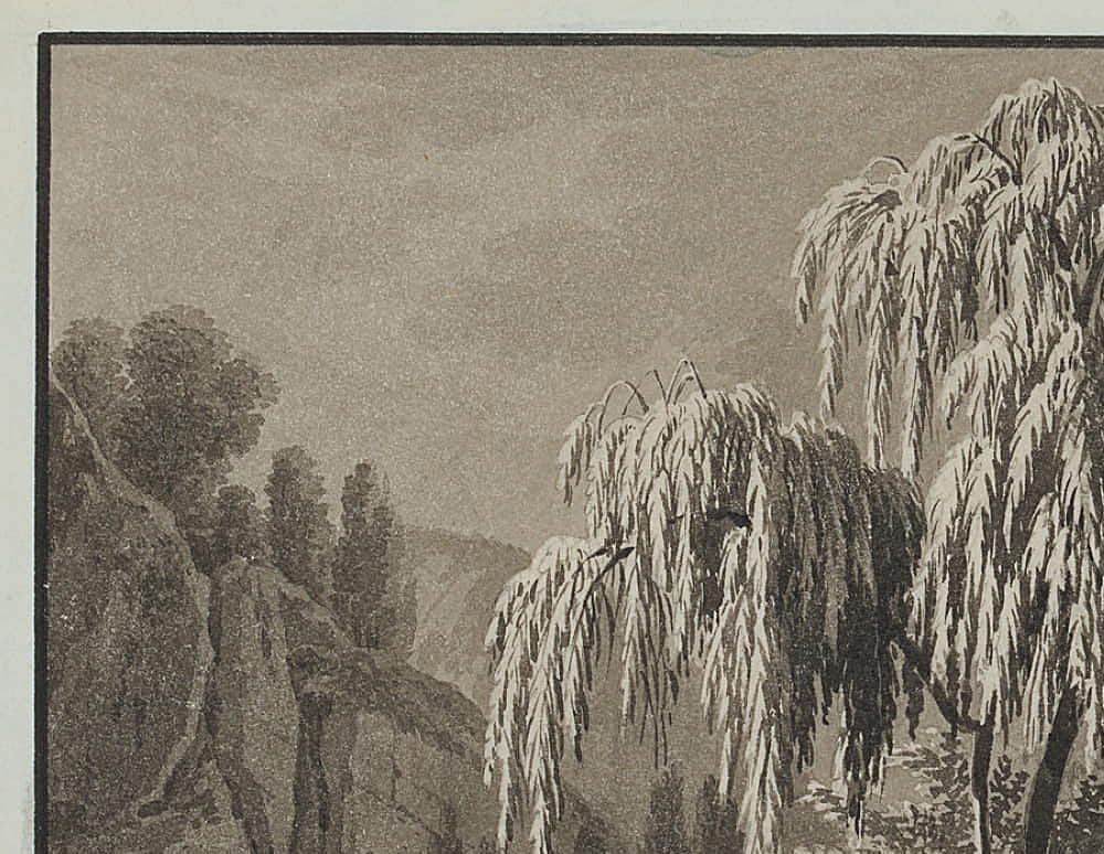 - Beschreibung: Sehr qualitätsvolles Gedenkblatt an einen Verstorbenen. Die Urne unter der Trauerweide und neben dem Putto mit der umgedrehten Fackel trägt das Monogramm “JvC”