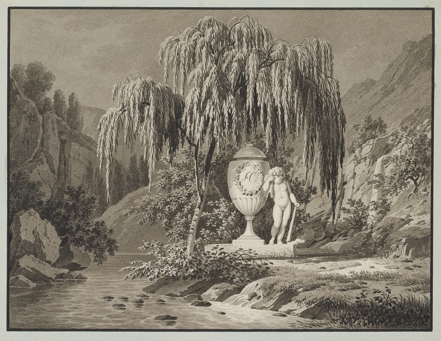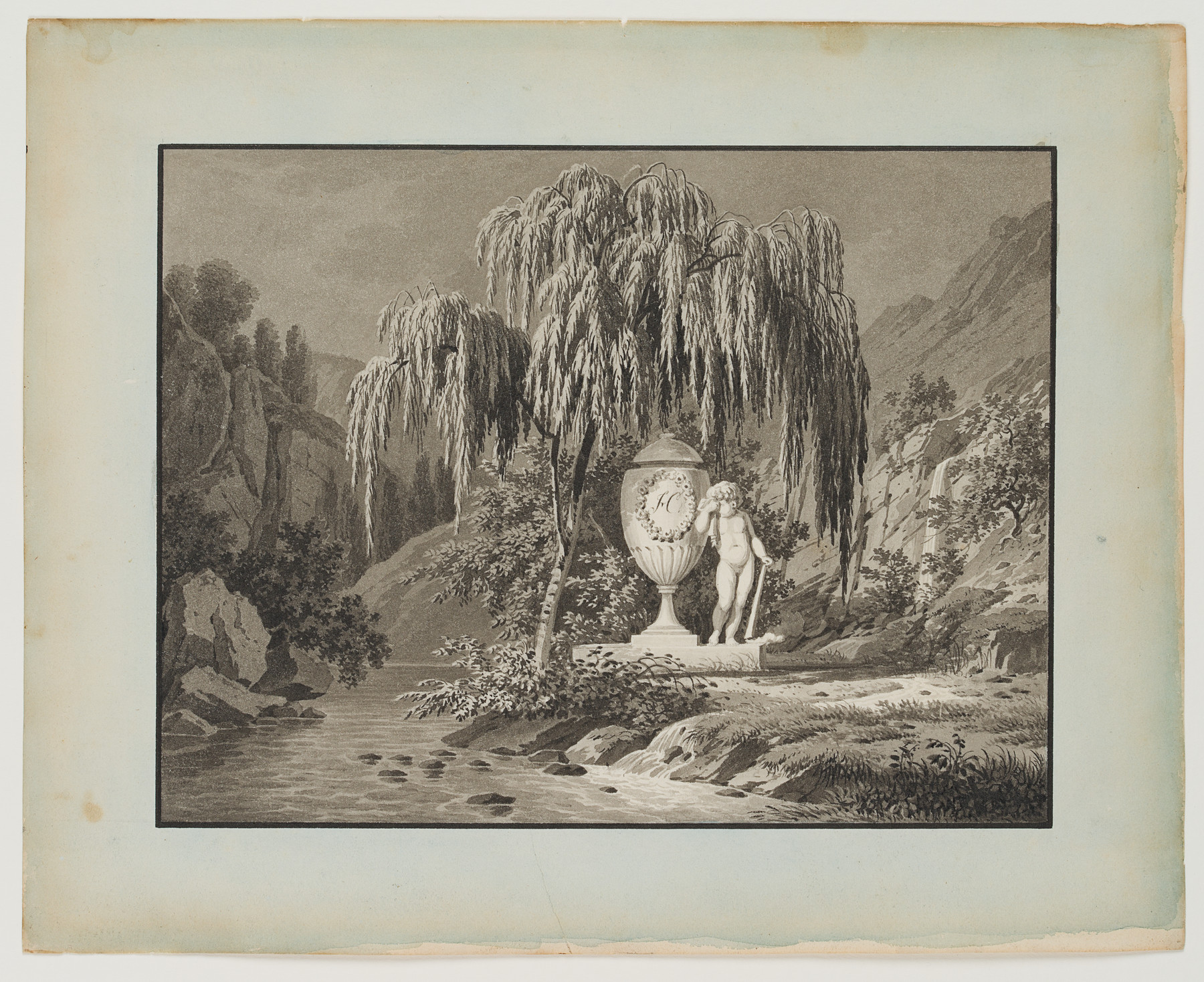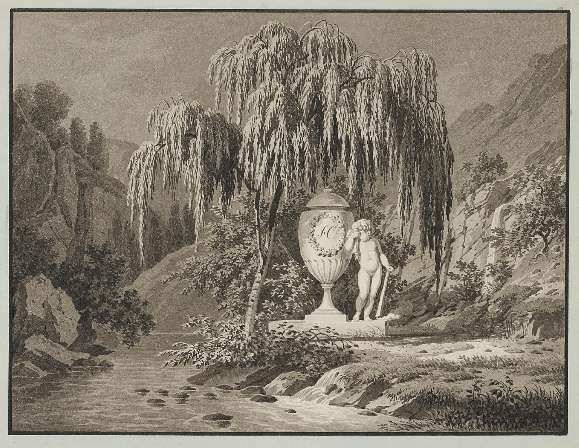 - Description: Very high quality memorial sheet to a deceased person. The urn under the weeping willow and next to the putto with the upturned torch bears the monogram “JvC”.