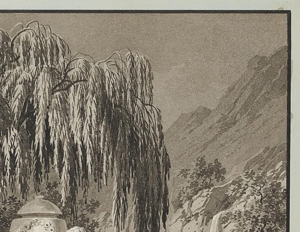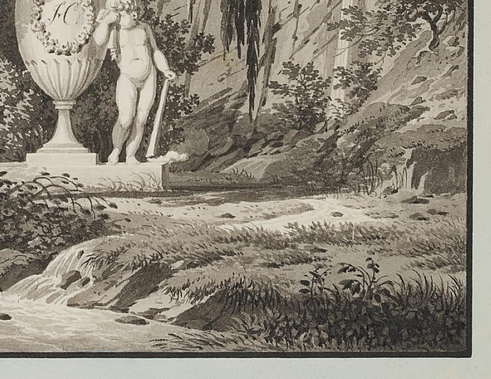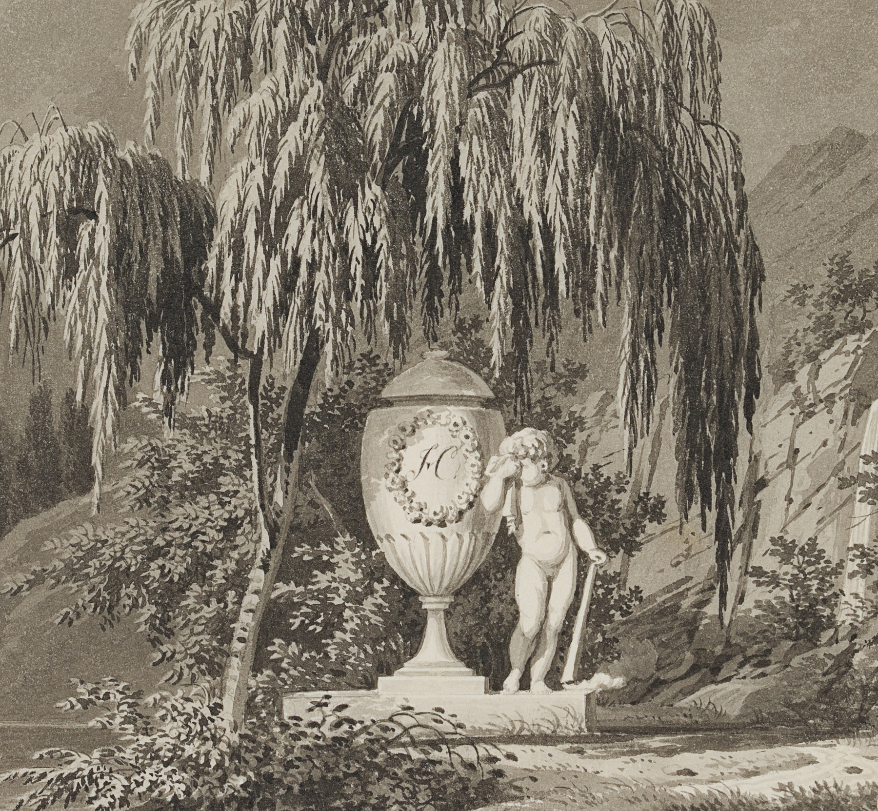 - Description: Very high quality memorial sheet to a deceased person. The urn under the weeping willow and next to the putto with the upturned torch bears the monogram “JvC”.