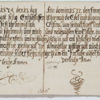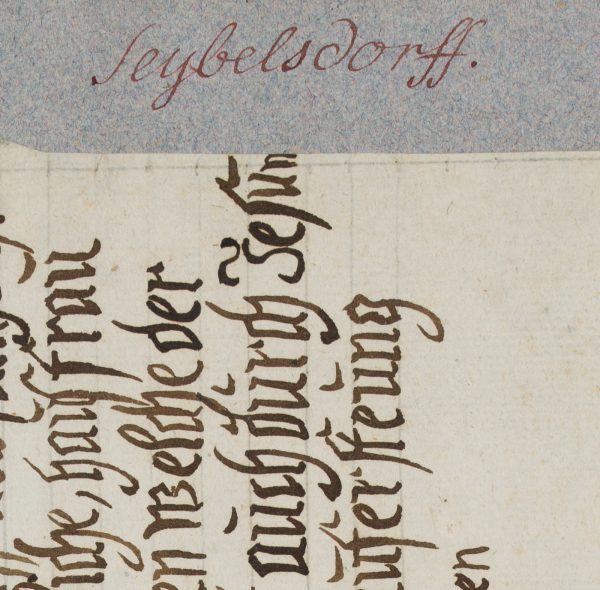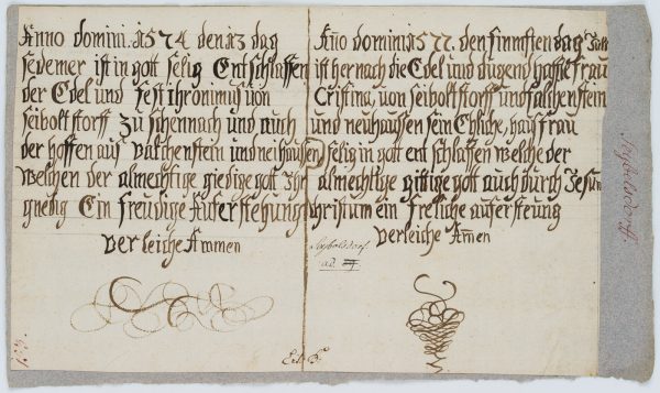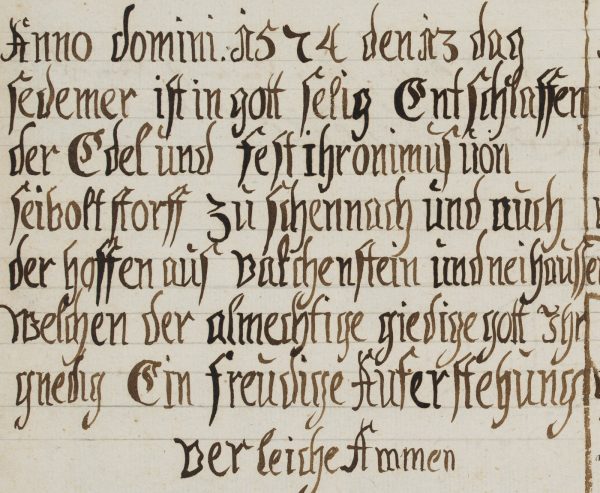 - Inscription: Inscribed at the top of the backing: “Seiboldsdorff”, the sheet shows the text field of the epitaph in two columns: “Anno domini 1574 ..ist in Gott selig entschlafen der Edel und fest Hieronymus von Seiboldorf ..der allmächtige gütige Gott Ihr gnädig ein freudige Auferstehung verleihe, Amen”.