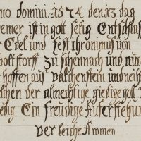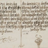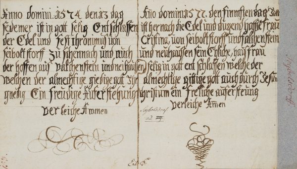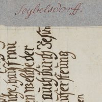 - Bezeichnung: Oben auf der Unterlage bezeichnet: “Seiboldsdorff”, das Blatt zeigt in zwei Spalten das Textfeld des Epitaphen: “Anno domini 1574 ..ist in Gott selig entschlafen der Edel und fest Hieronymus von Seiboldorf ..der allmächtige gütige Gott Ihr gnädig ein freudige Auferstehung verleihe, Amen.”