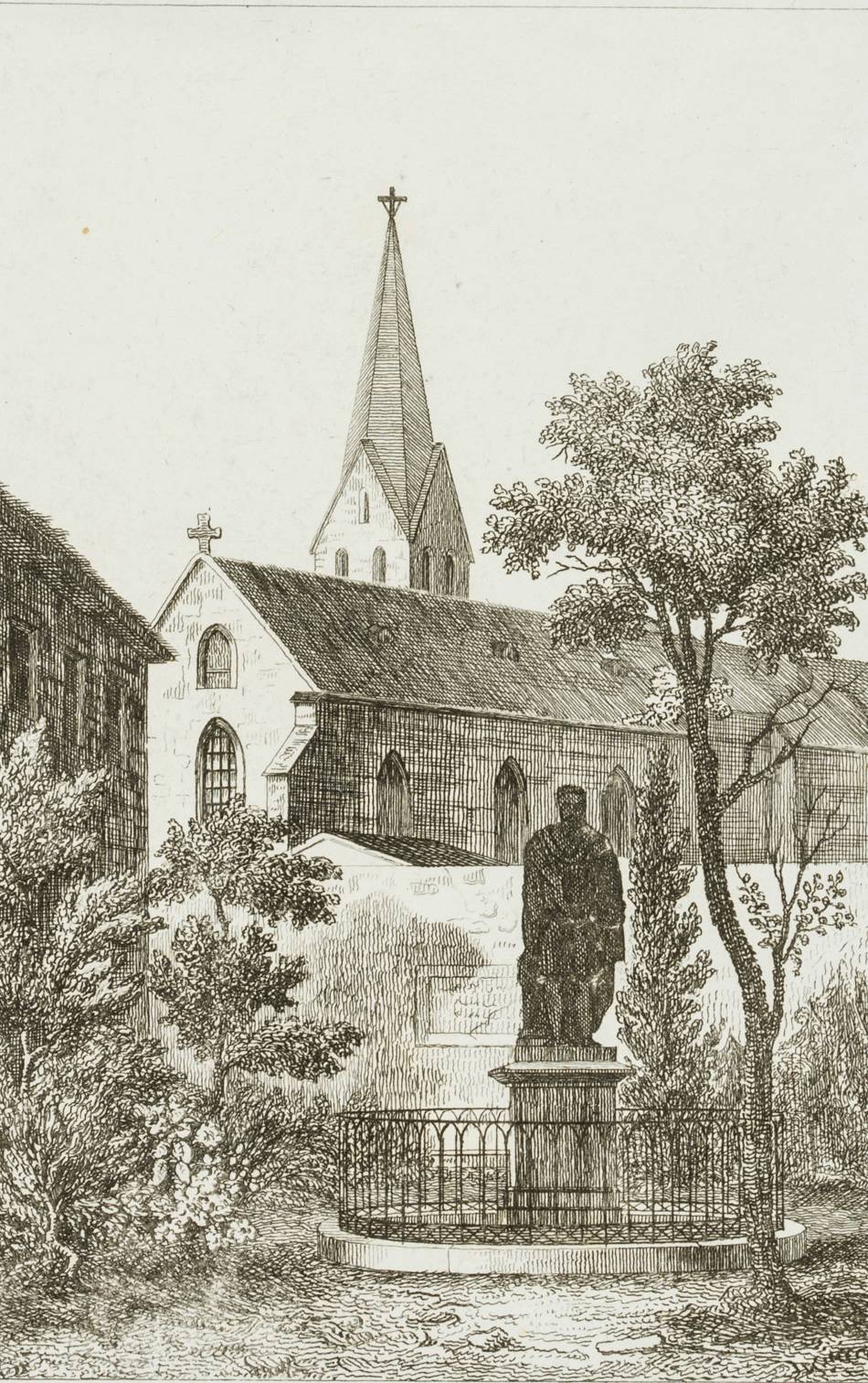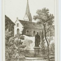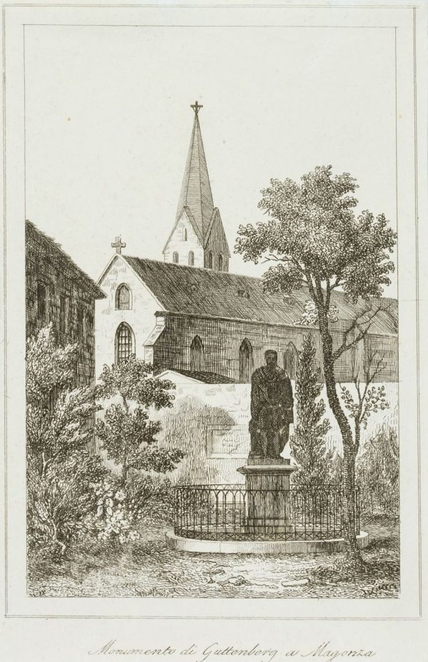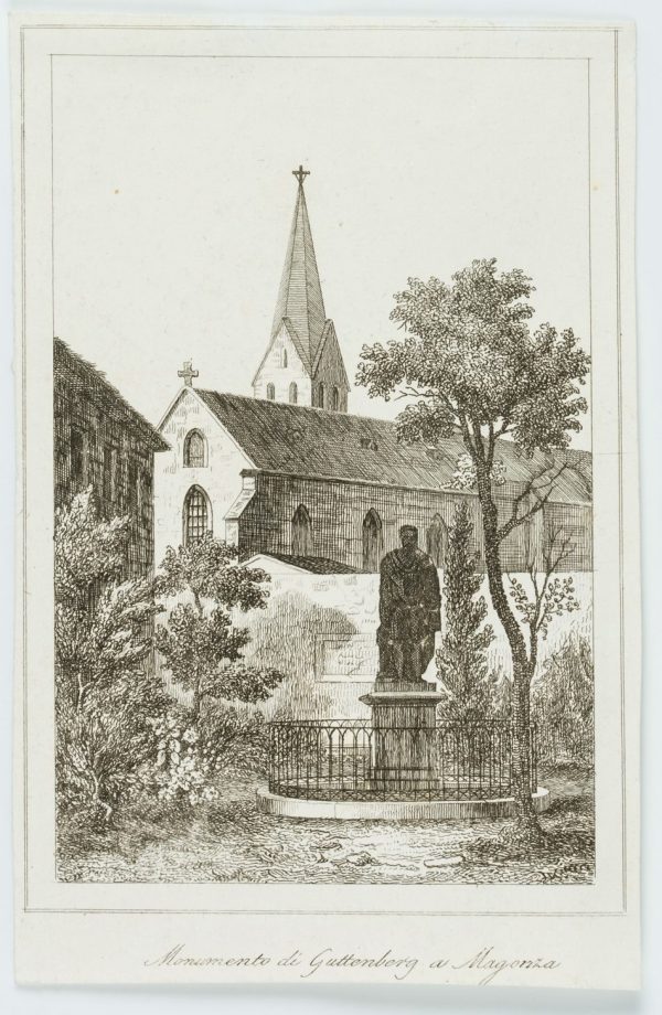 - Description: Illustration of the Gutenberg monument in Mainz, probably from an Italian travelogue. Inscribed at the bottom centre „Monumento di Guttenberg a Magonza“.