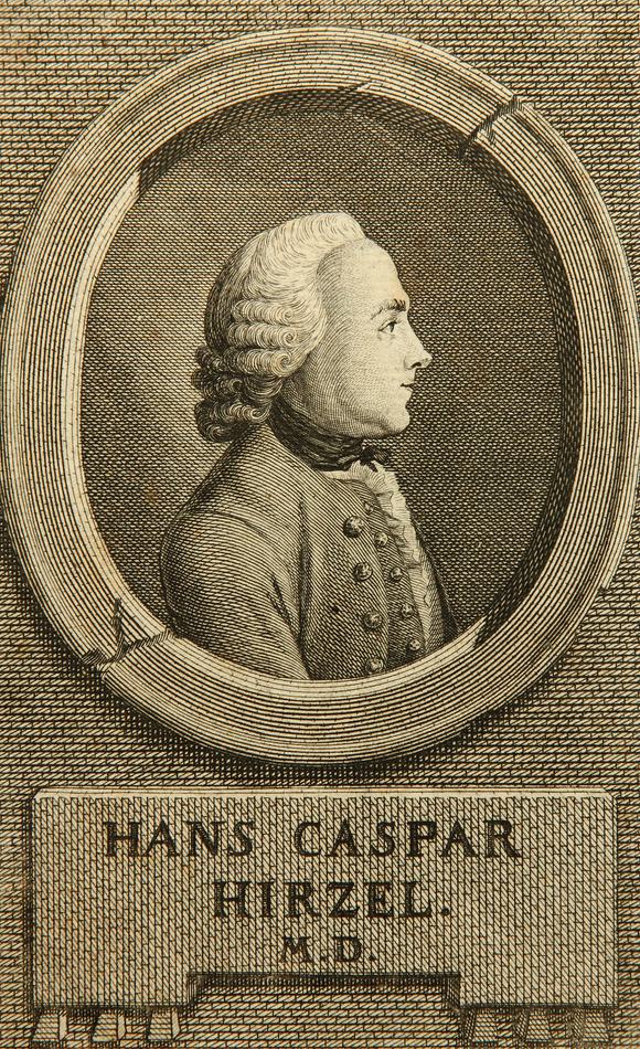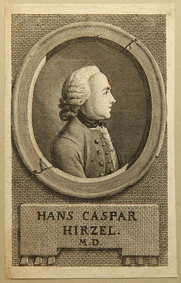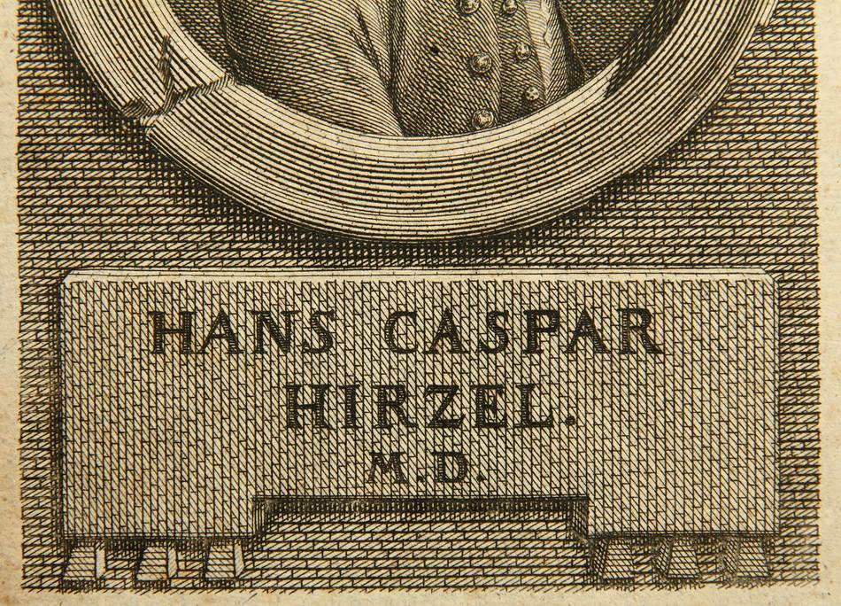 • Bezeichnung: Unterhalb mit dem Namen des Dargestellten bezeichnet: “Hans Caspar Hirzel. M.D.”.