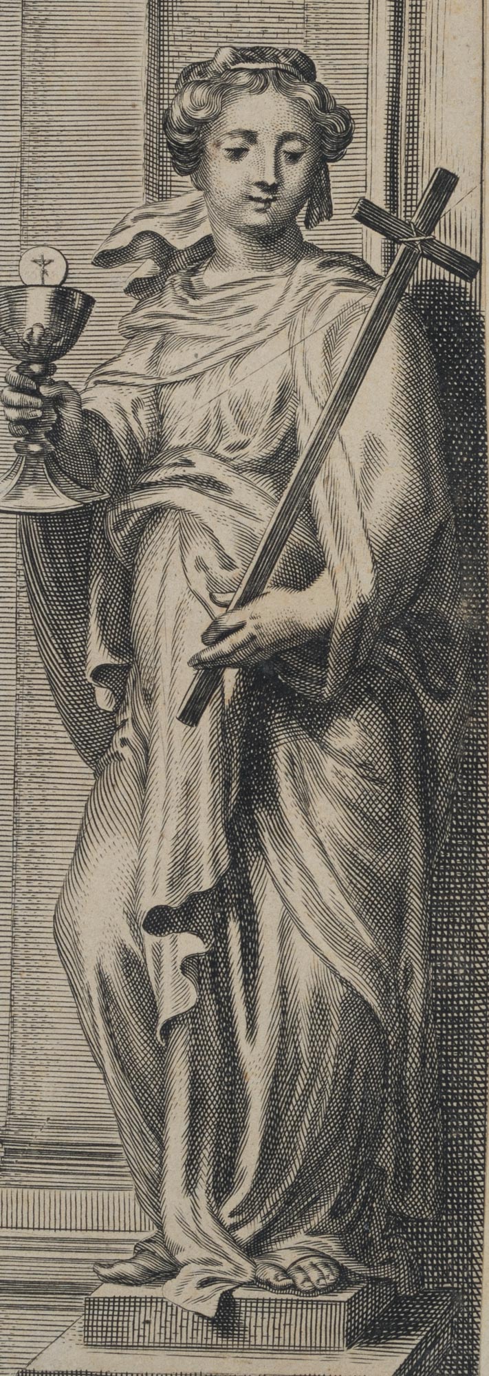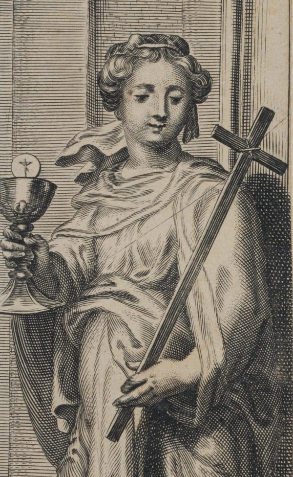 Unbekannt (18. Jahrhundert), Heiligendarstellung, Heilige in klassisch antikisierter Gewandung mit Hostie, Kelch und Kreuz, 18. Jahrhundert, Kupferstich