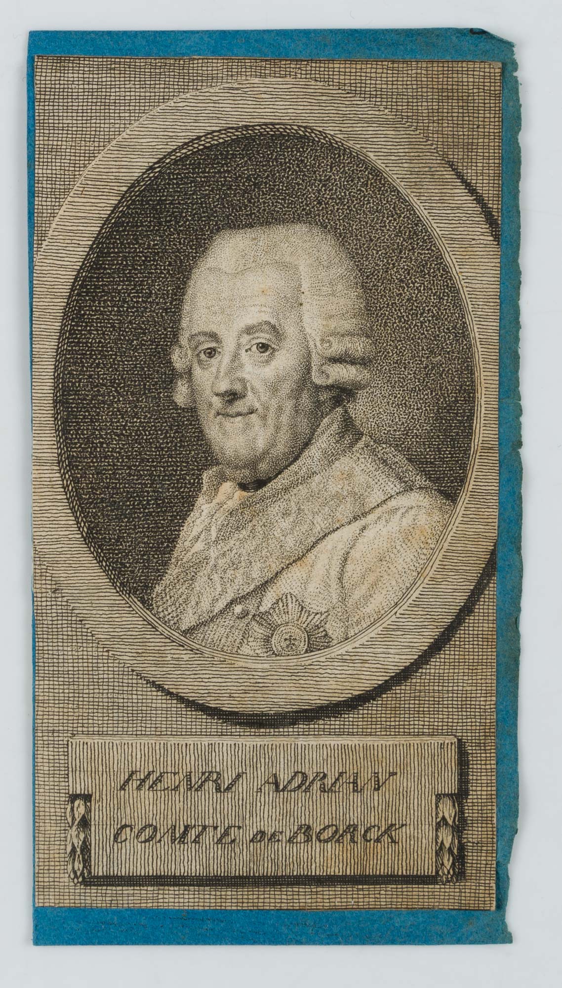 - Beschreibung: Unter dem Oval genageltes Täfelchen betitelt “Henri Adrian Comte de Borck”.