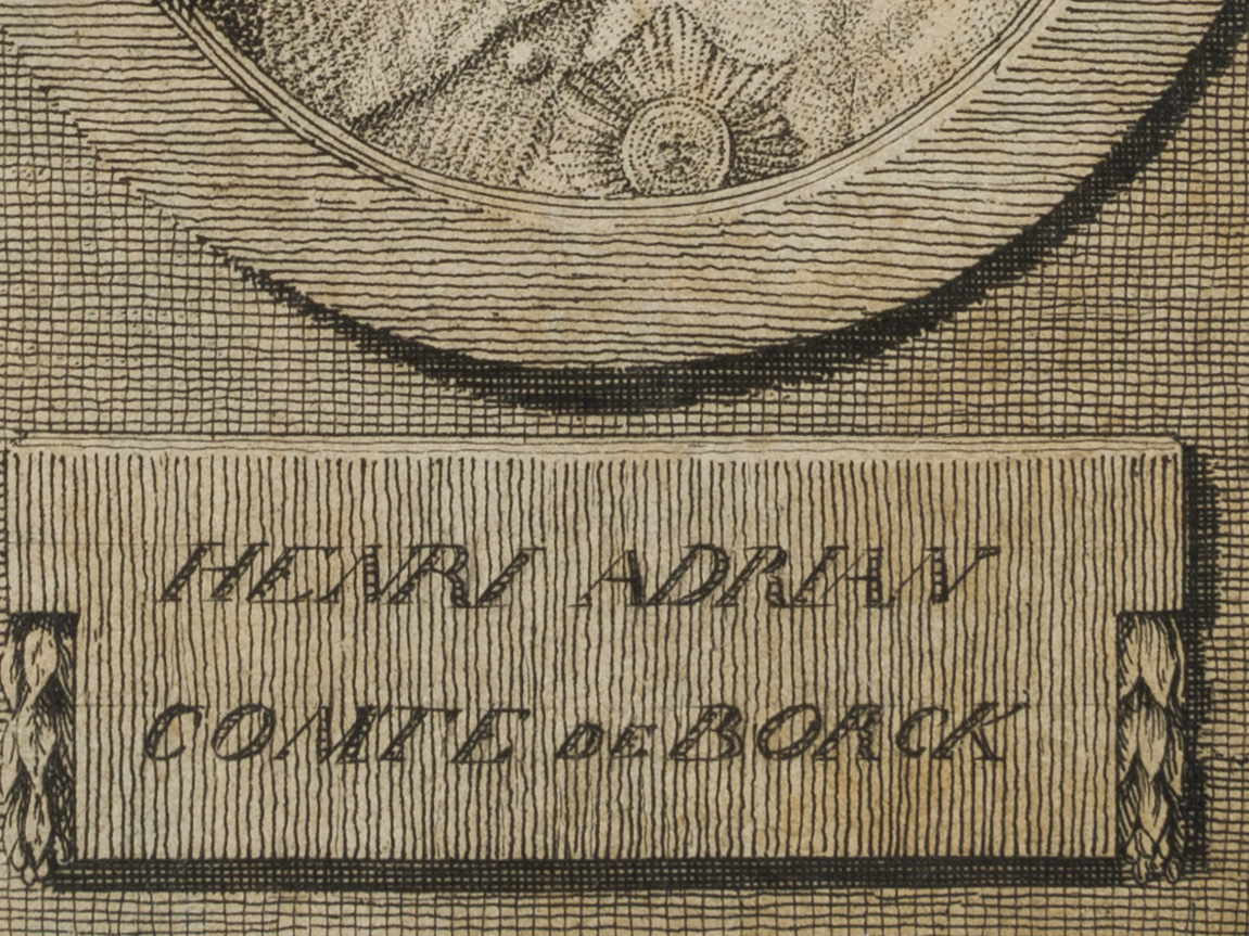 - Description: A nailed plaque titled “Henri Adrian Comte de Borck” under the oval.