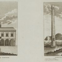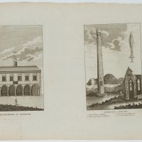 - Beschreibung: Architekturdarstellung des Gebäudes in Limerick unterhalb beschriftet, Graphik rechts zeigt verschiedene irische Architekturen, die nummeriert und beschriftet sind, darunter: “Round Tower at Kildare”, “Ruins of a convent at Kildare”, “A Tumulus near Tipperary” und “an ancient brafs sword”.