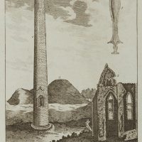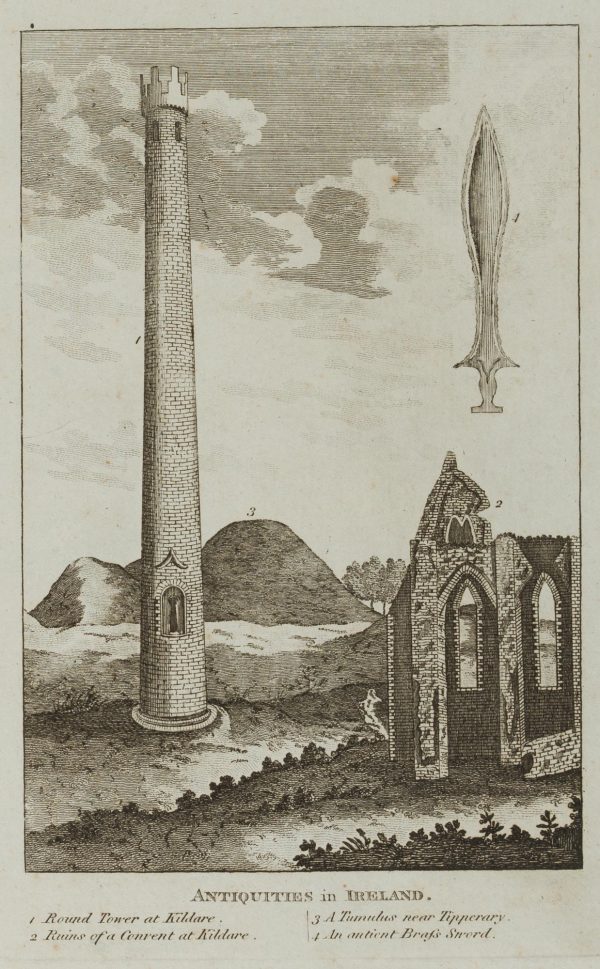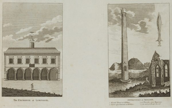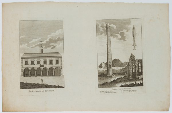 - Description: Architectural depiction of the building in Limerick inscribed below, graphic on right showing various Irish architectures numbered and inscribed including: “Round Tower at Kildare”, “Ruins of a convent at Kildare”, “A Tumulus near Tipperary” and “an ancient brafs sword”.