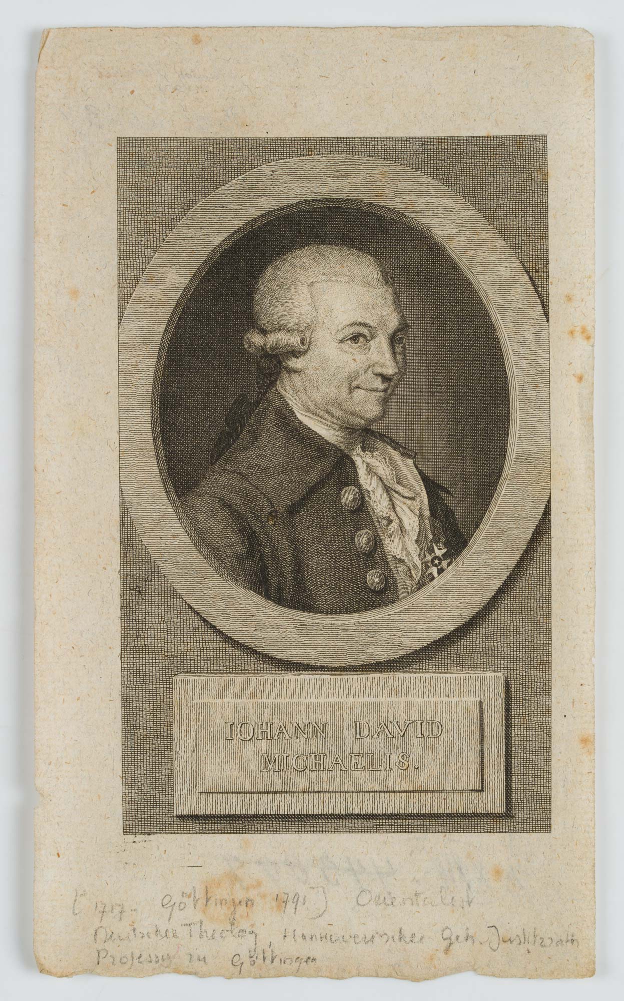 Unknown (18th century), Portrait of Johann David Michaelis (1717 Halle – 1791 Göttingen), German theologian at the time of the Enlightenment, orientalist, professor at Göttingen, oval bust in three-quarter profile to the right, 18th century, Copper engraving