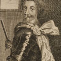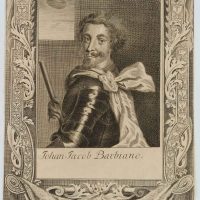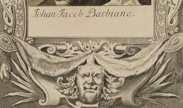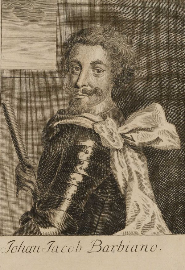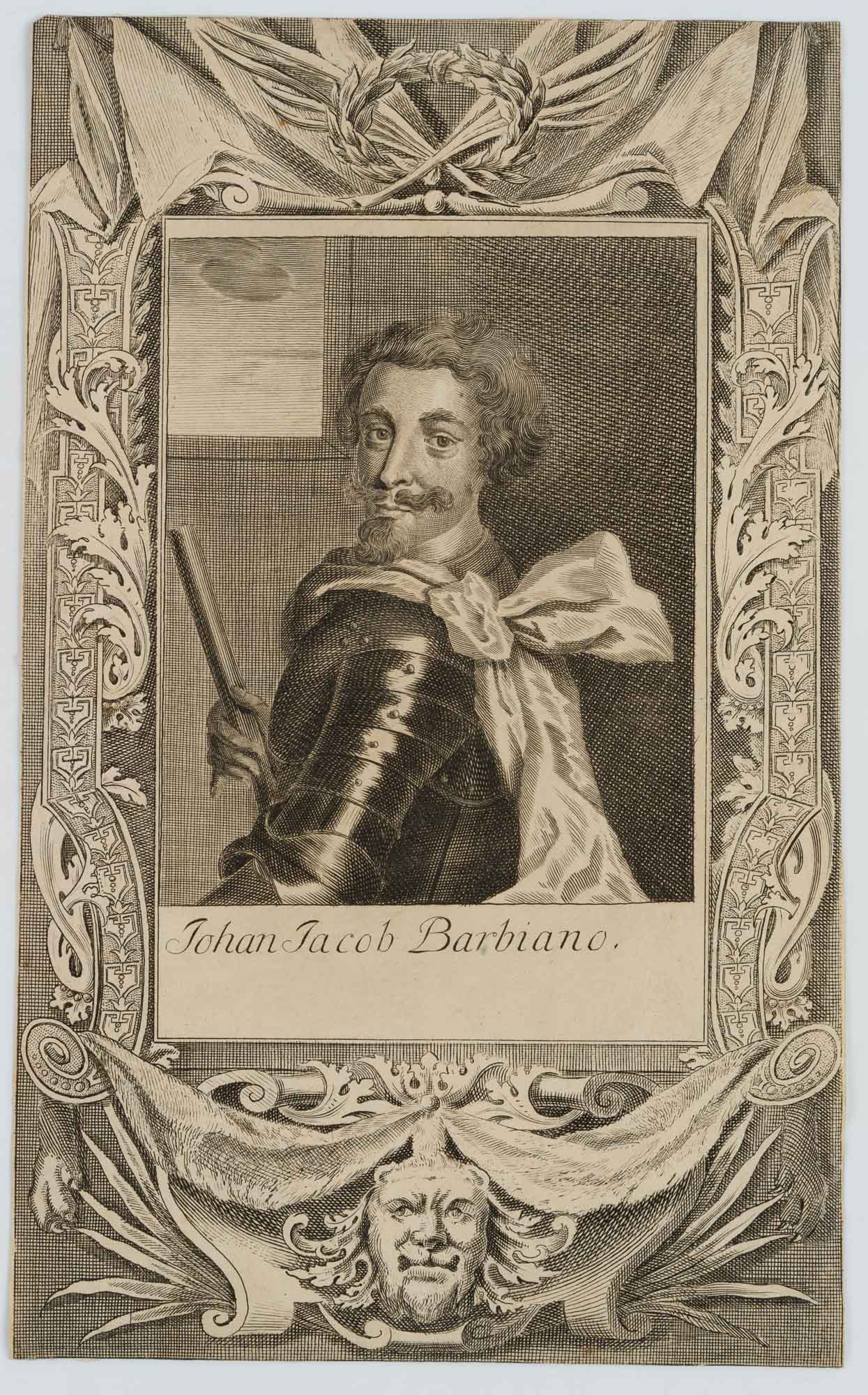 Unbekannt (18. Jahrhundert), Portrait des Johann Jacob Barbian, Graf Belgioso (1565 – 1616), in einem Ornament verziertem Rahmen, als Hüftstück in Rüstung nach links mit Blick auf den Betrachter gerichtet, 18. Jahrhundert, Kupferstich
