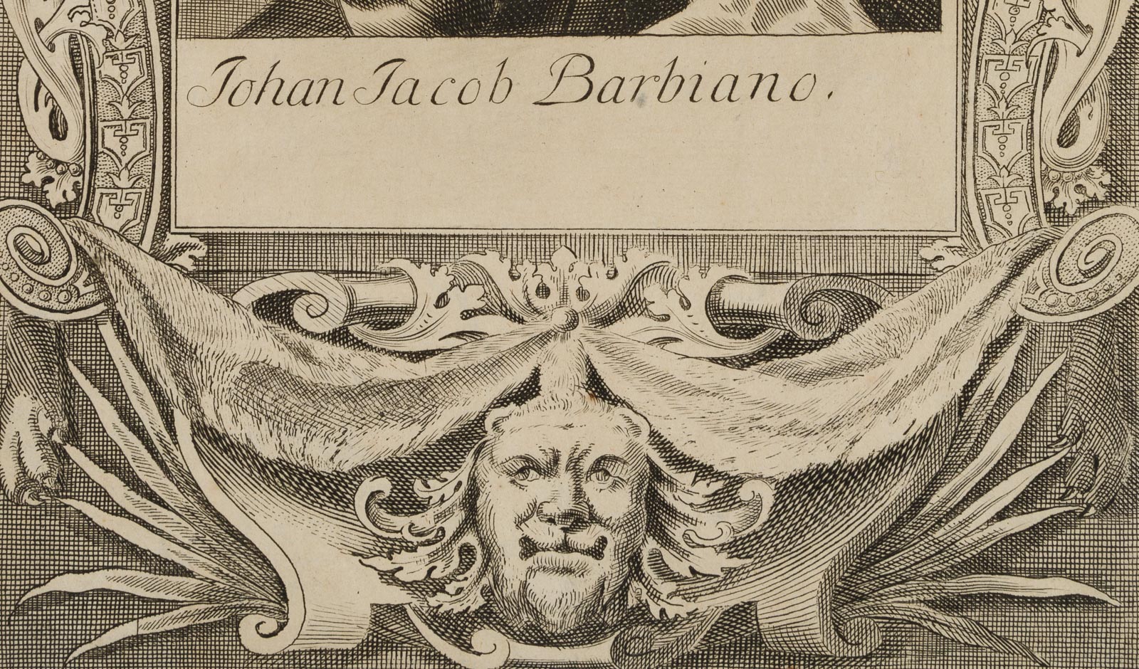 Unknown (18th century), Portrait of Johann Jacob Barbian, Count Belgioso (1565 – 1616), in an ornament-decorated frame, as a hip piece in armour to the left, looking towards the viewer, 18th century, Copper engraving