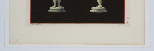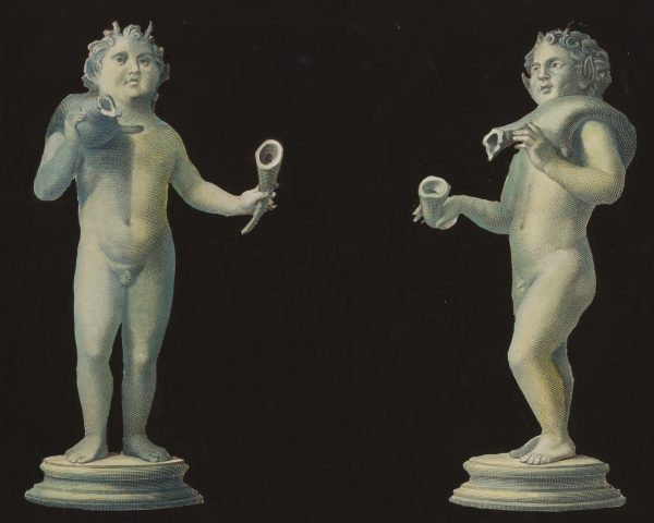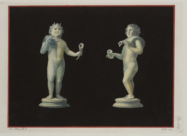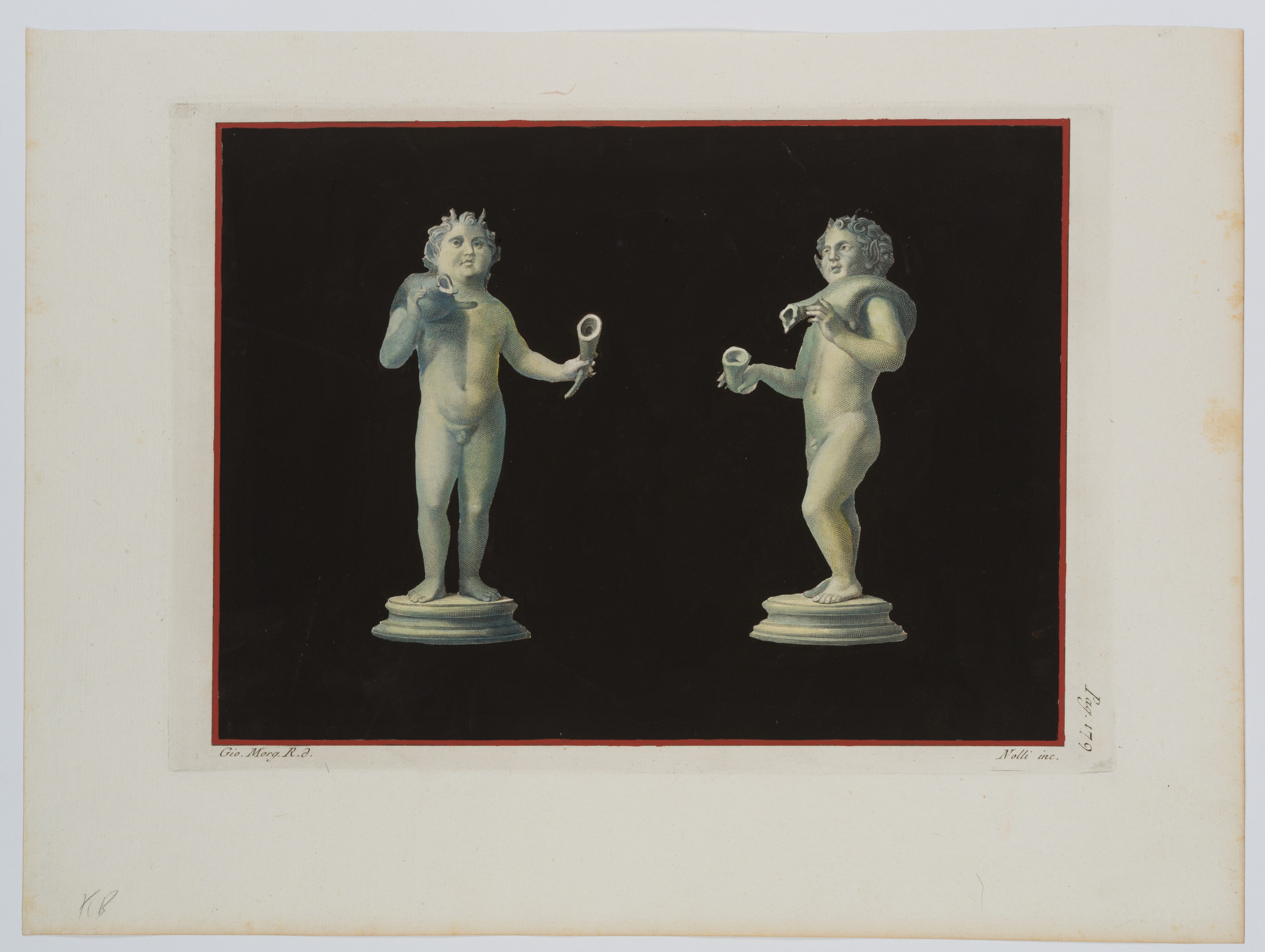 Unbekannt (18. Jahrhundert), Skulptur eines jungen Bacchanten mit Füllhorn in zwei Ansichten frontal und seitlich. Nach pompejanischen Fresken, , Kupferstich