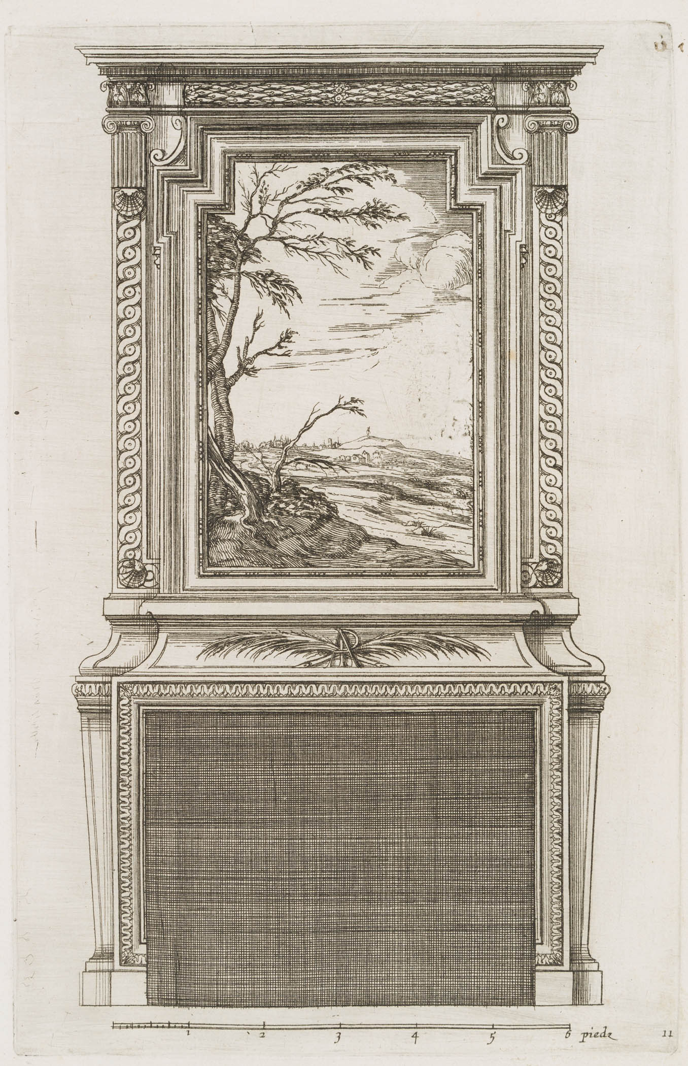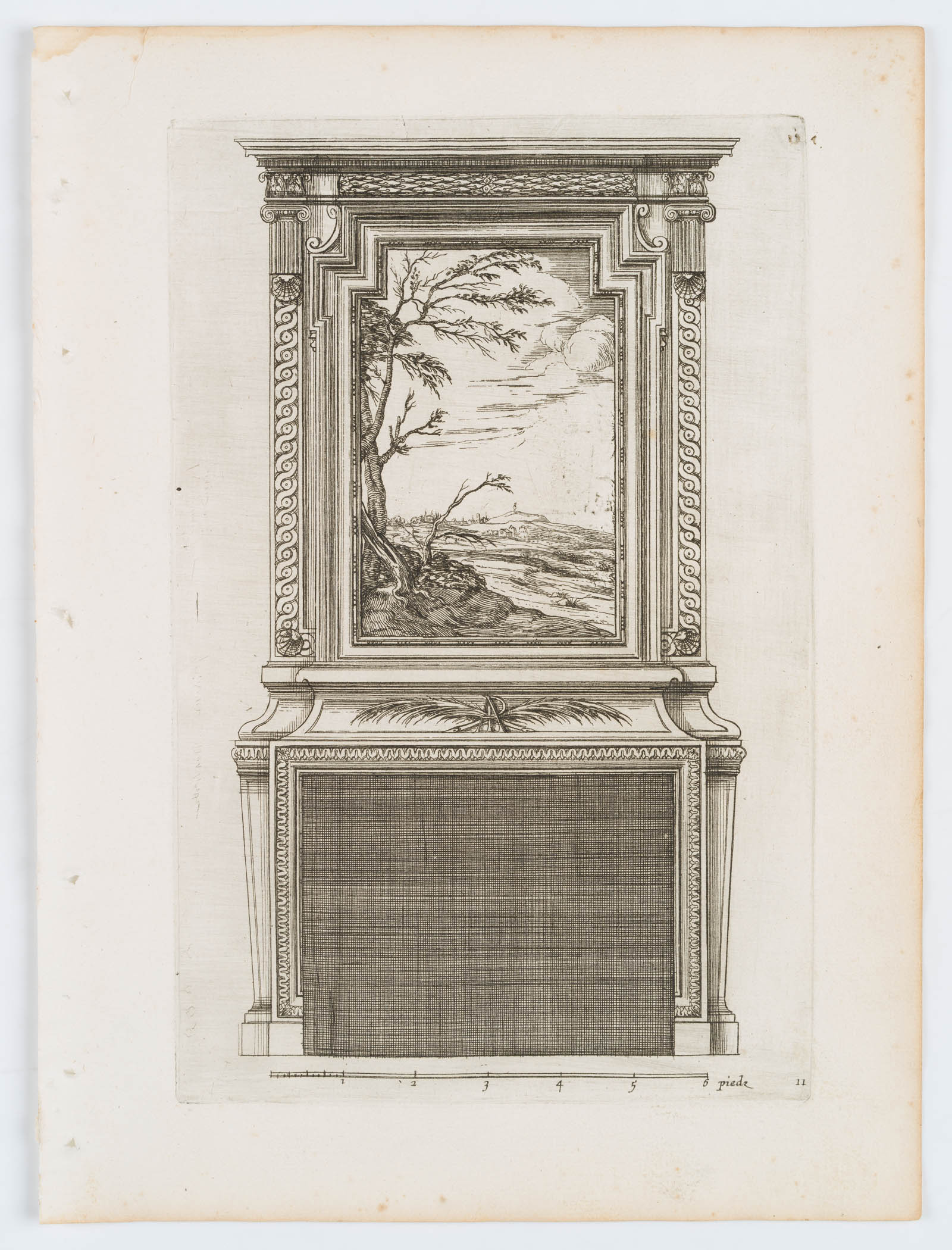 Unbekannt (18. Jahrhundert), Kaminentwurf mit Landschaftsdarstellung schmuckvoll gerahmt. Vorlage 11, um 1750, Kupferstich