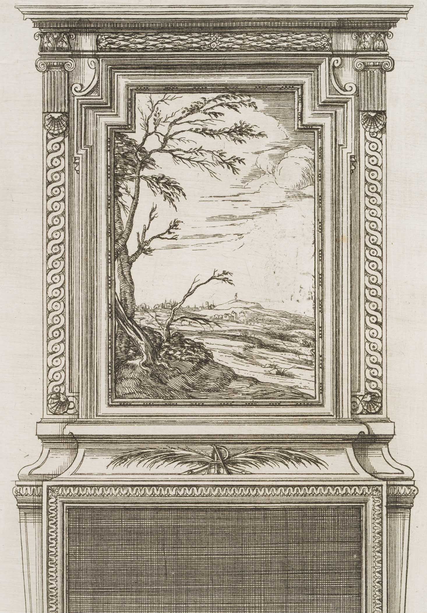 - Description: Above with depiction of a landscape in a decorative frame with frieze and column elements.