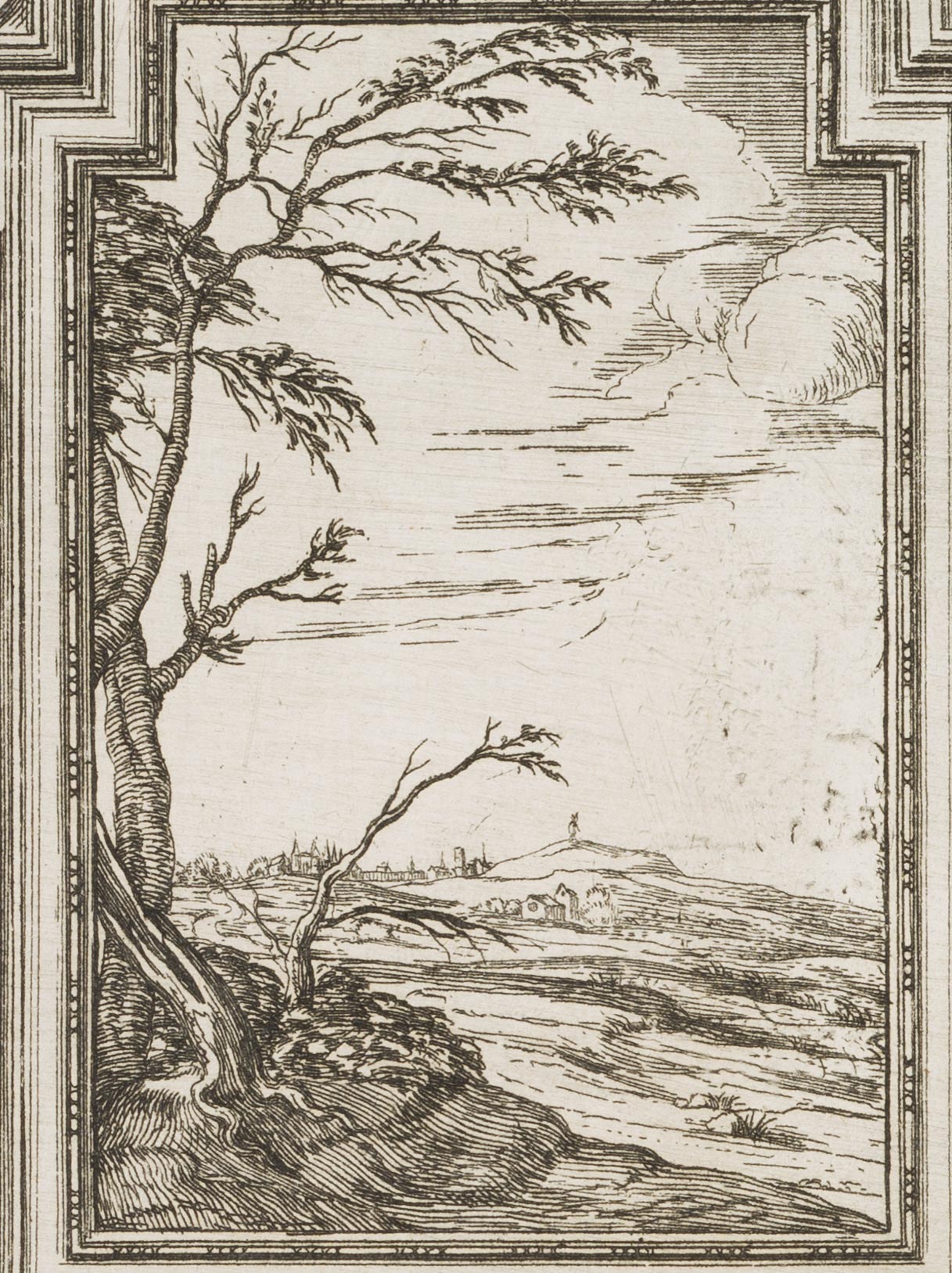 - Beschreibung: Oben mit Darstellung einer Landschaft in einem Schmuckrahmen mit Fries und Seulenelementen.