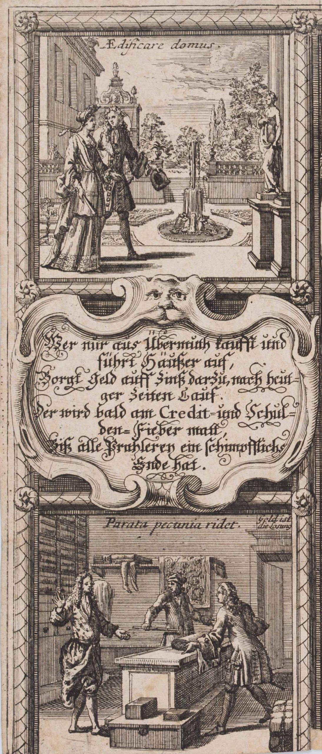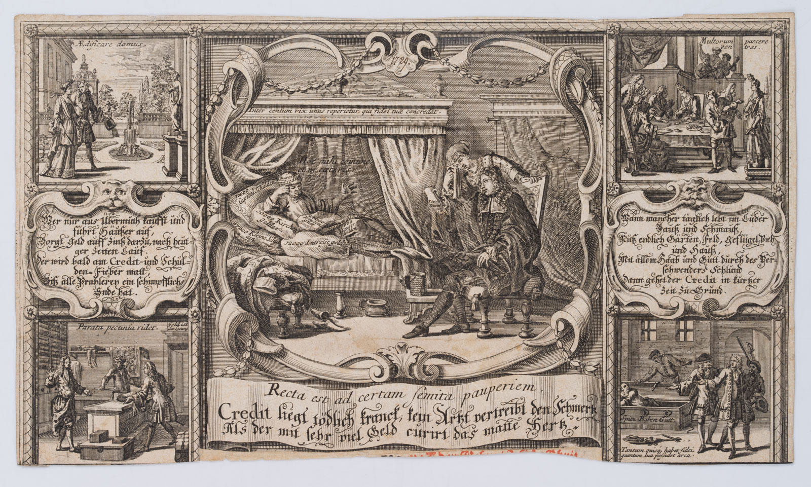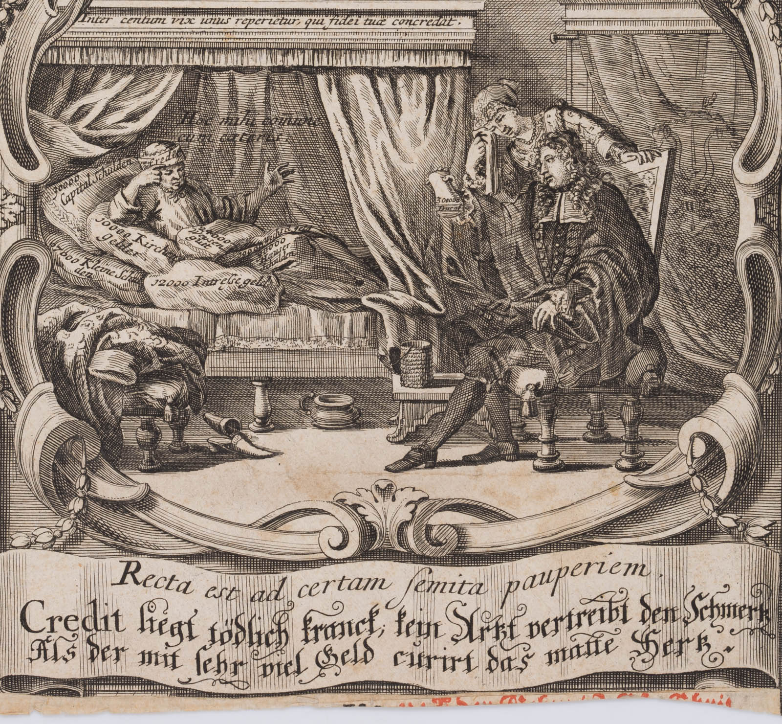- Beschreibung: “Recta est ad certam semita pauperiem. Credit liegt tödlich kranck, kein Arzt vertreibt den Schmerz. Als der mit sehr viel Geld curiert das matte Hertz.”.