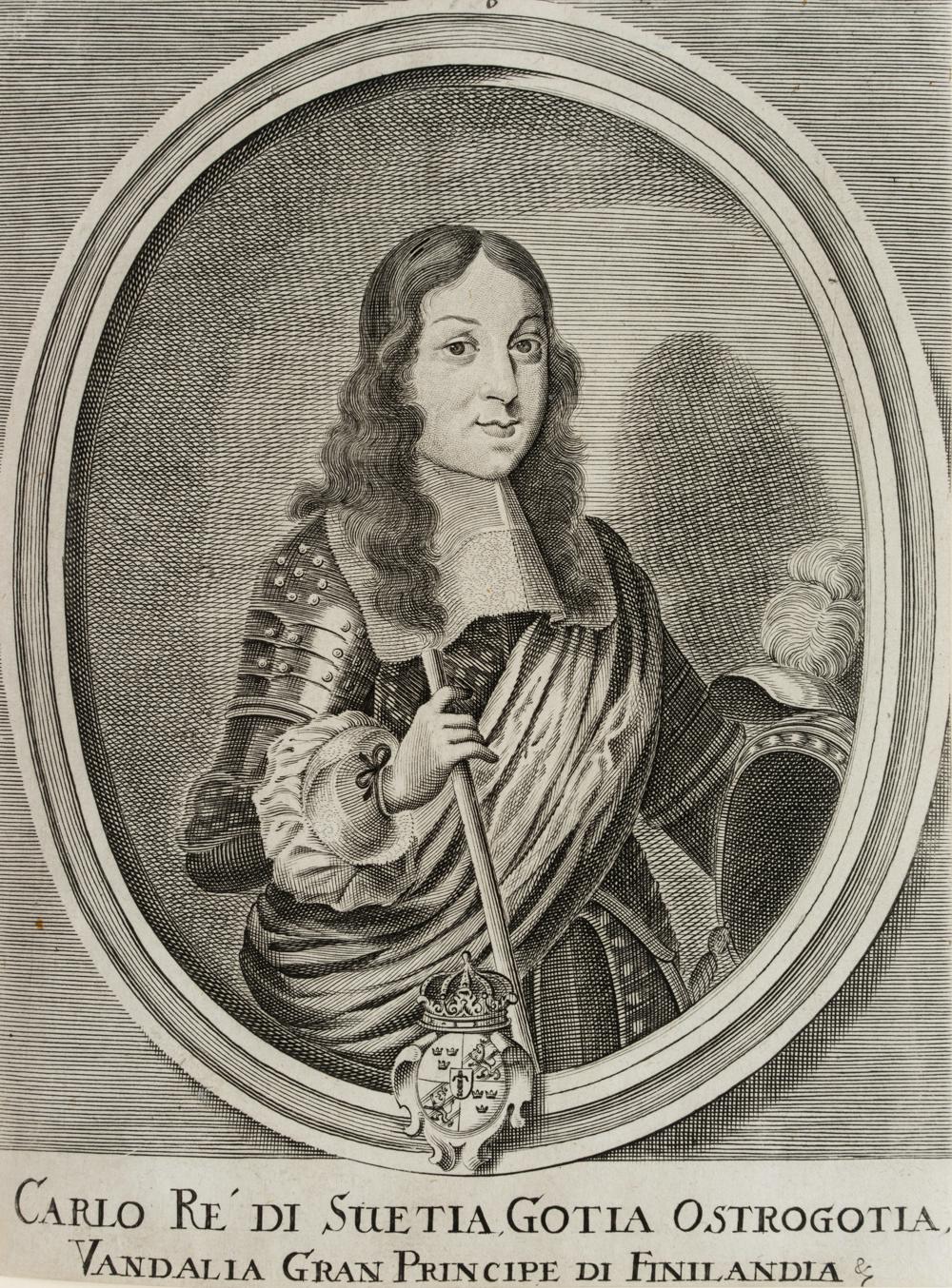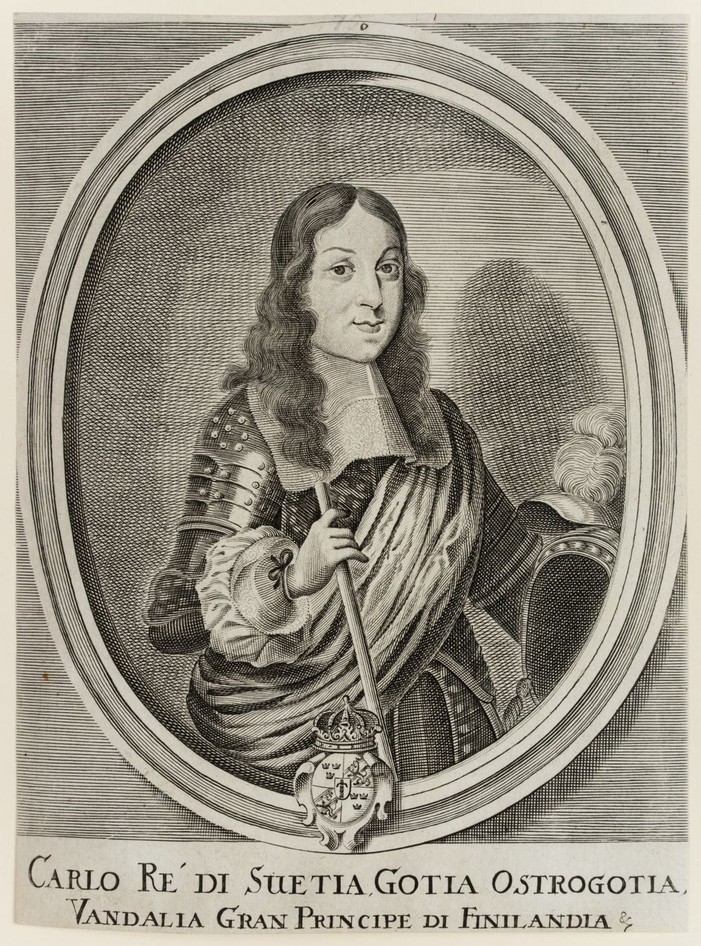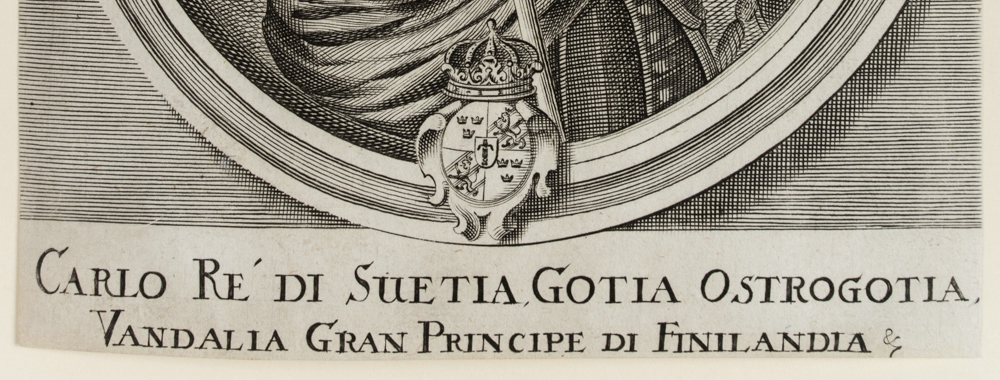 - Description: Half-length portrait in oval profile. Below is the sitter’s coat of arms. Inscribed below in the printing plate: “Carlo Ré di Suetia, Gotia Ostrogotia, Vandalia Gran Principe di Finilandia”.