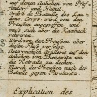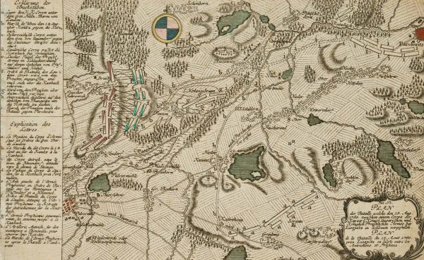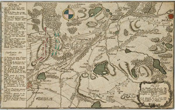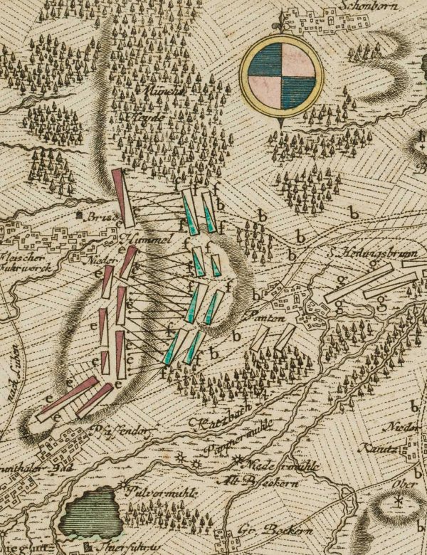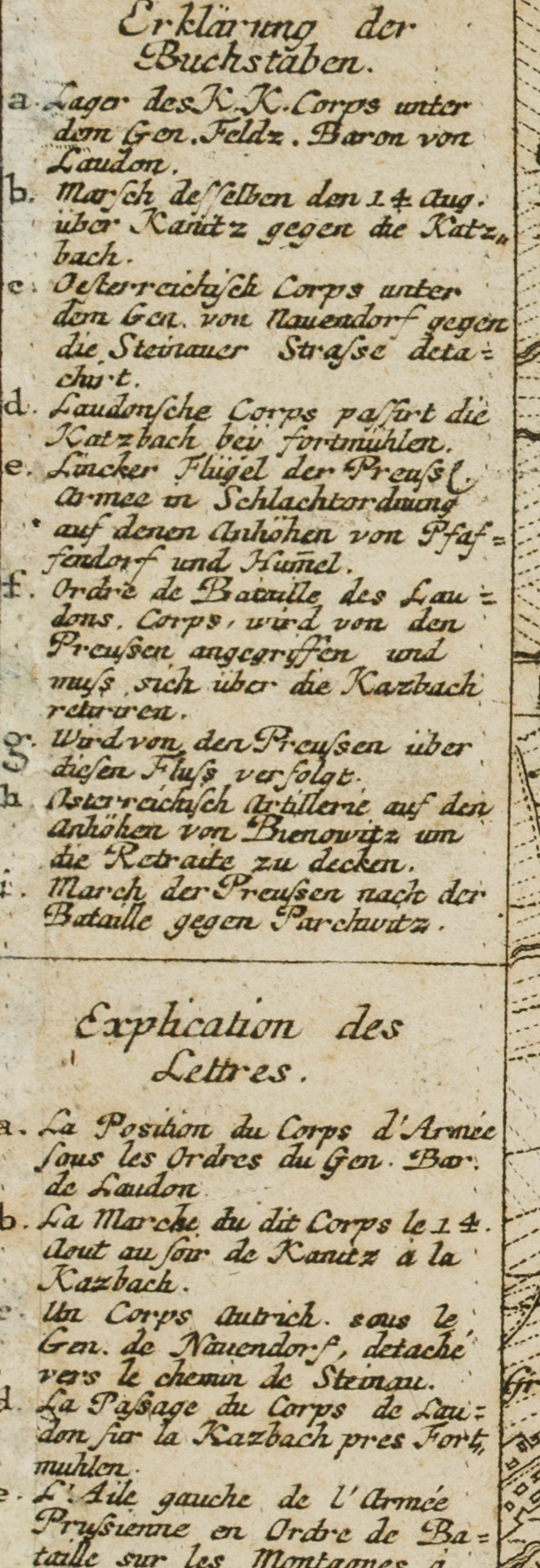 - Description: Very beautiful, partially coloured map from the work “Neues Kriegs-Theater. – Plan of the battle between the victorious Prussian troops under the command of Frederick II and the Austrian army under Field Marshal Gideon Ernst von Laudon. With decorative title cartouche in the lower right part of the image as well as with a small coloured compass rose at the top; at the left side with “Erklärung der Buchstaben / Explication des Lettres”, in German and French; numbered at the top of the title cartouche: “No. 53”; at the back side later inscribed with collection number “XX. 352526”; published by Leipzig, circa 1760.