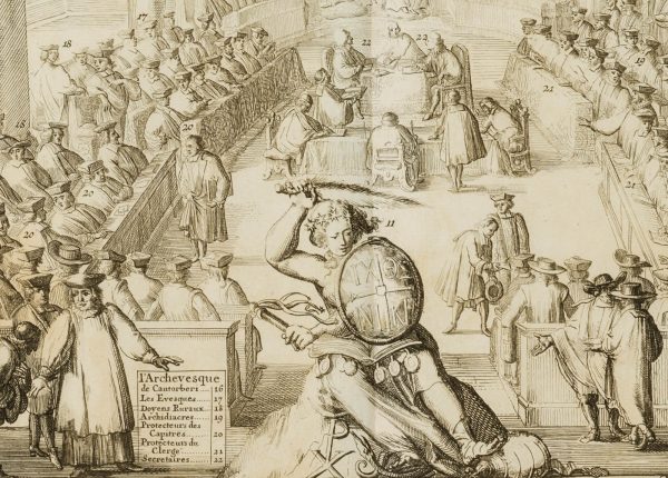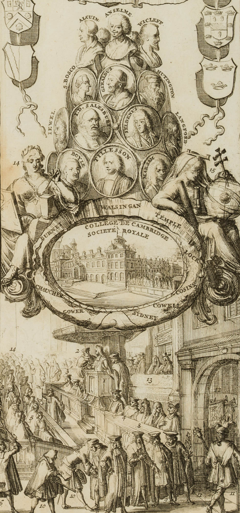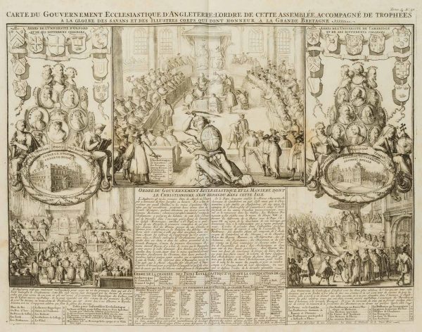 - Description: This sheet shows an organigram of three graphics accompanied by texts and legends. The central graphic shows an assembly of the ecclesiastical order of England. This ecclesiastical order is flanked by university institutions. The left-hand illustration represents the University of Oxford with a view of the university building, coat of arms and the dignitaries of the institution. The right-hand illustration represents the University of Cambridge. This print also shows the various office holders, coats of arms, portraits and an architectural view of the university building. The sheet is titled above: “CARTE DU GOUVERNEMENT ECCLESIASTIQUE D’ANGLETERRE: LORDRE DE CETTE ASSEMBLEE, ACCOMPAGNE DE TROPHEES A LA GLOIRE DES SAVANS ET DES ILLUSTRES CORPS QUI FONT HONNEUR A LA GRANDE BRETAGNE”.