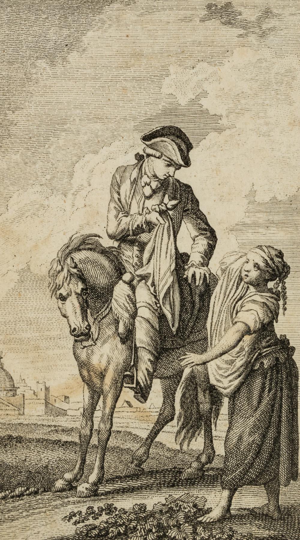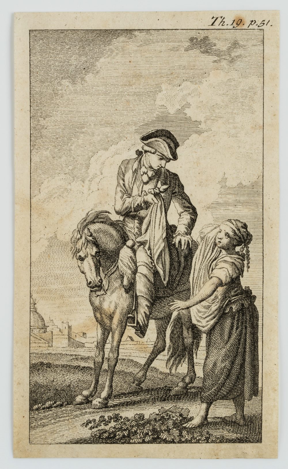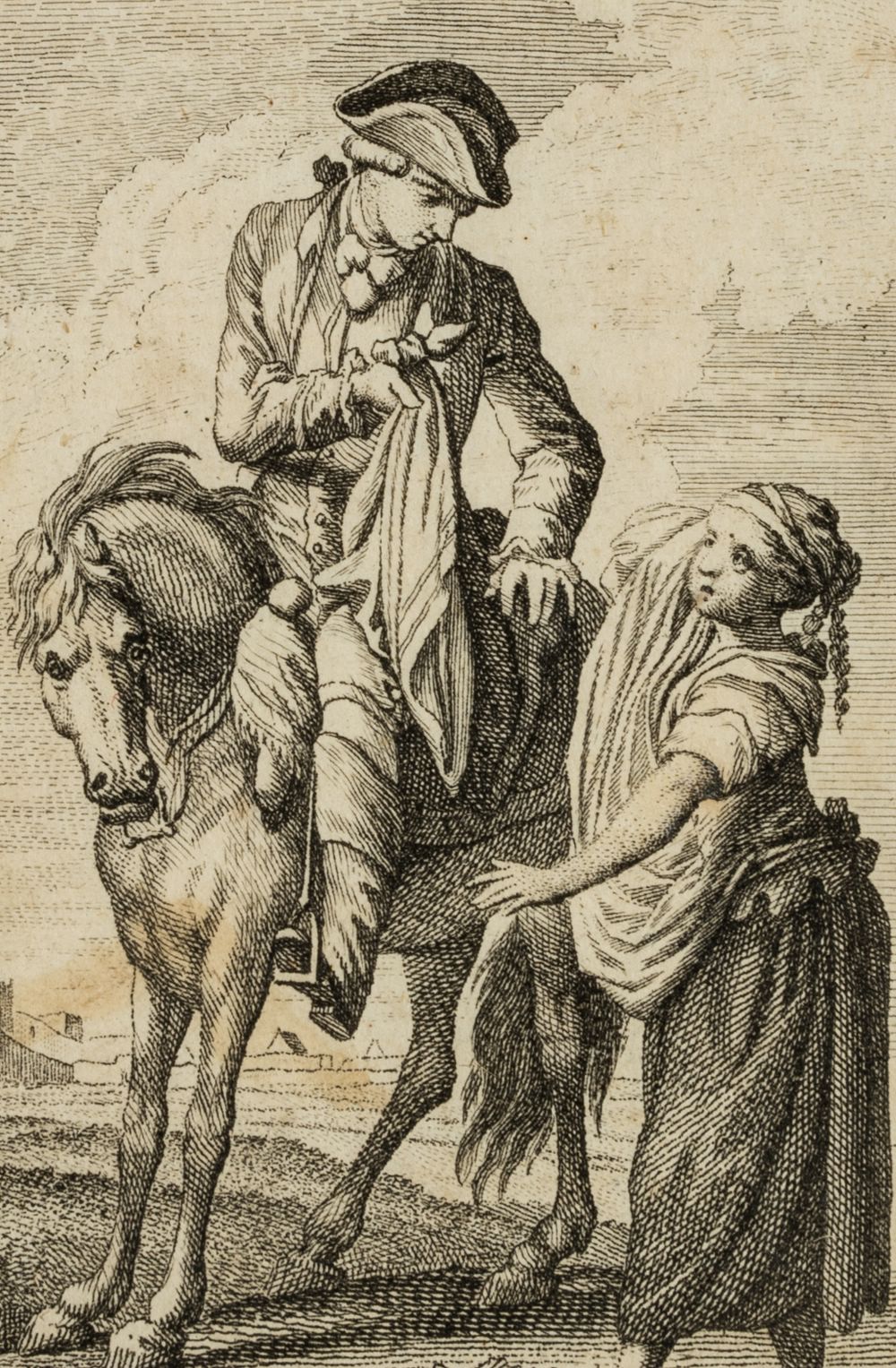 • Beschreibung: Miniaturisierte Kostümszene. Eine vermutlich aus England stammende Illustrationen der Literatur des 18. Jahrhundert. Vermutlich aus einem Roman des Klassizismus, der Aufklärung oder des Regency, der Epoche Jane Austens. Zeigt einen Kavalier zu Pferd, der einem weinenden Mädchen ein Taschentuch reicht.