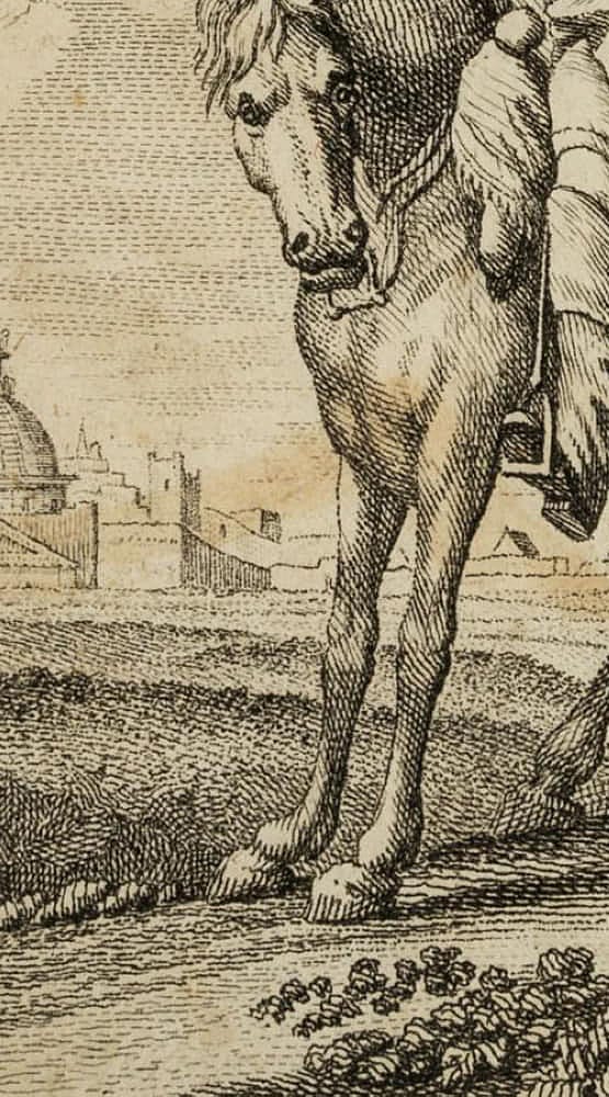 Miniaturisierte Kostümszene. Eine vermutlich aus England stammende Illustrationen der Literatur des 18. Jahrhundert. Vermutlich aus einem Roman des Klassizismus, der Aufklärung oder des Regency, der Epoche Jane Austens. Zeigt einen Kavalier zu Pferd, der einem weinenden Mädchen ein Taschentuch reicht.