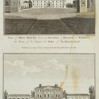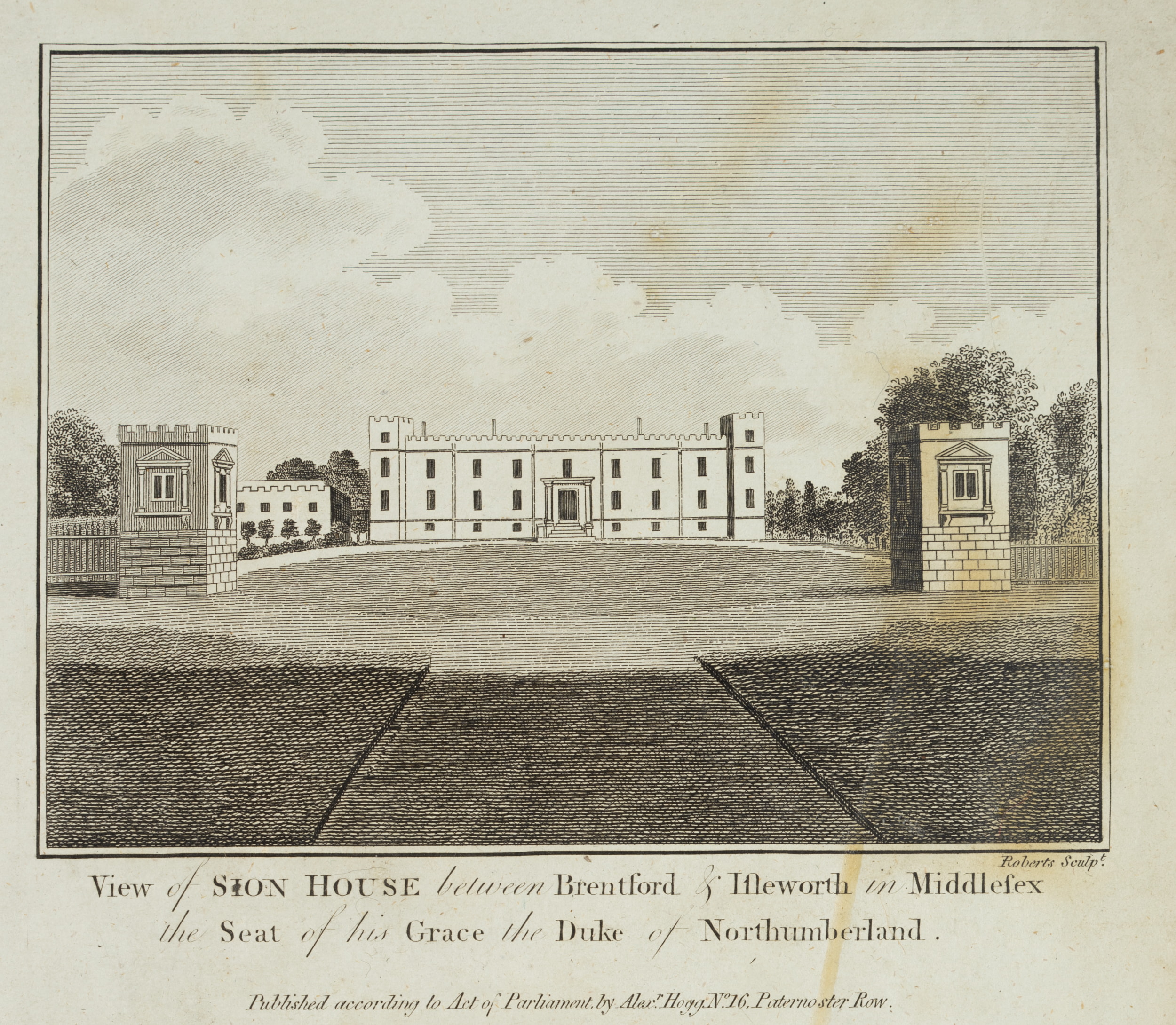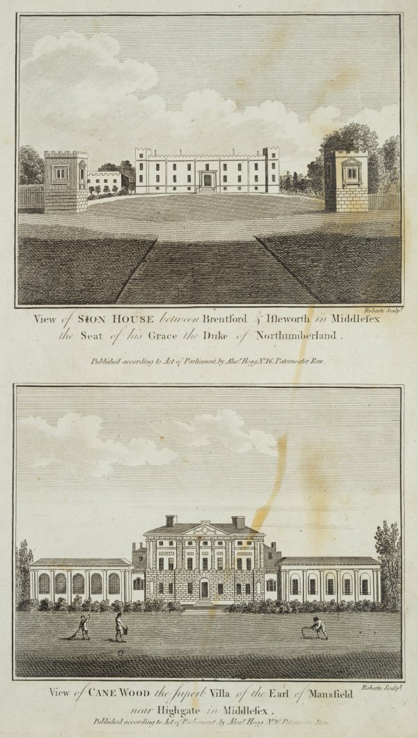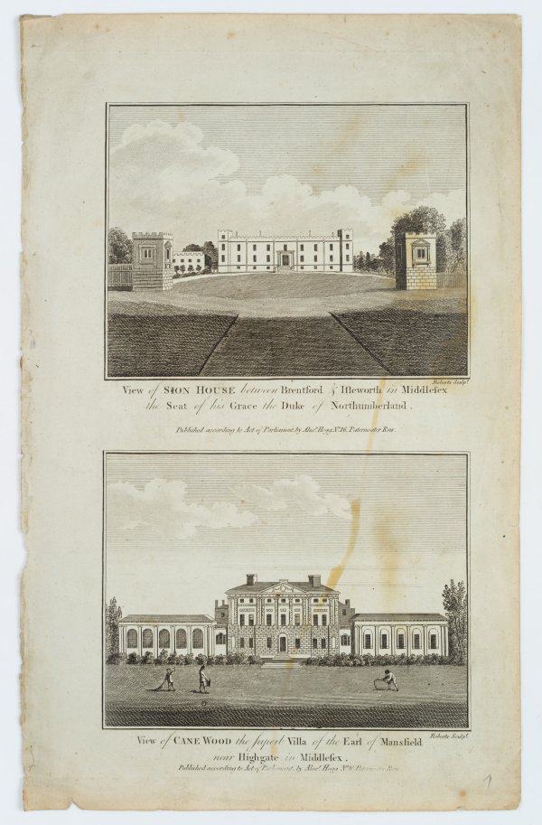 - Inscription: Lower right signed in the printing plate: “Roberts Sculp.”. Lower middle inscribed in the printing plate: “View of Sion House between Brentford & Isleworth in Middlesex the Seat of his Grace the Duke of Northumberland. | View of Cane Wood the superb Villa of the Earl of Mansfield near Highgate in Middlesex.”.