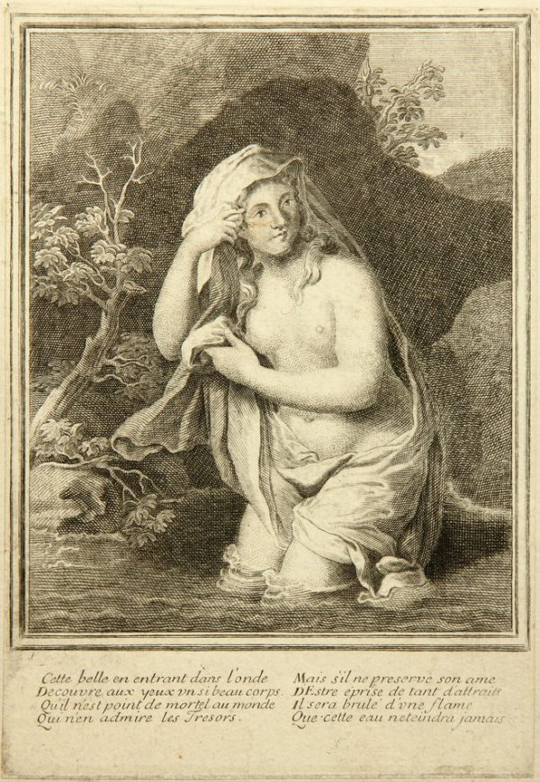 Unknown (18th century), Chaste beauty bathing, 18th century, Copper engraving