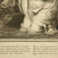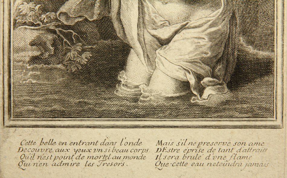 - Inscription: The artist’s signature is visible in the printing plate below the depiction. Inscribed below in French: “Cette belle en entrant dans l’onde […]”.