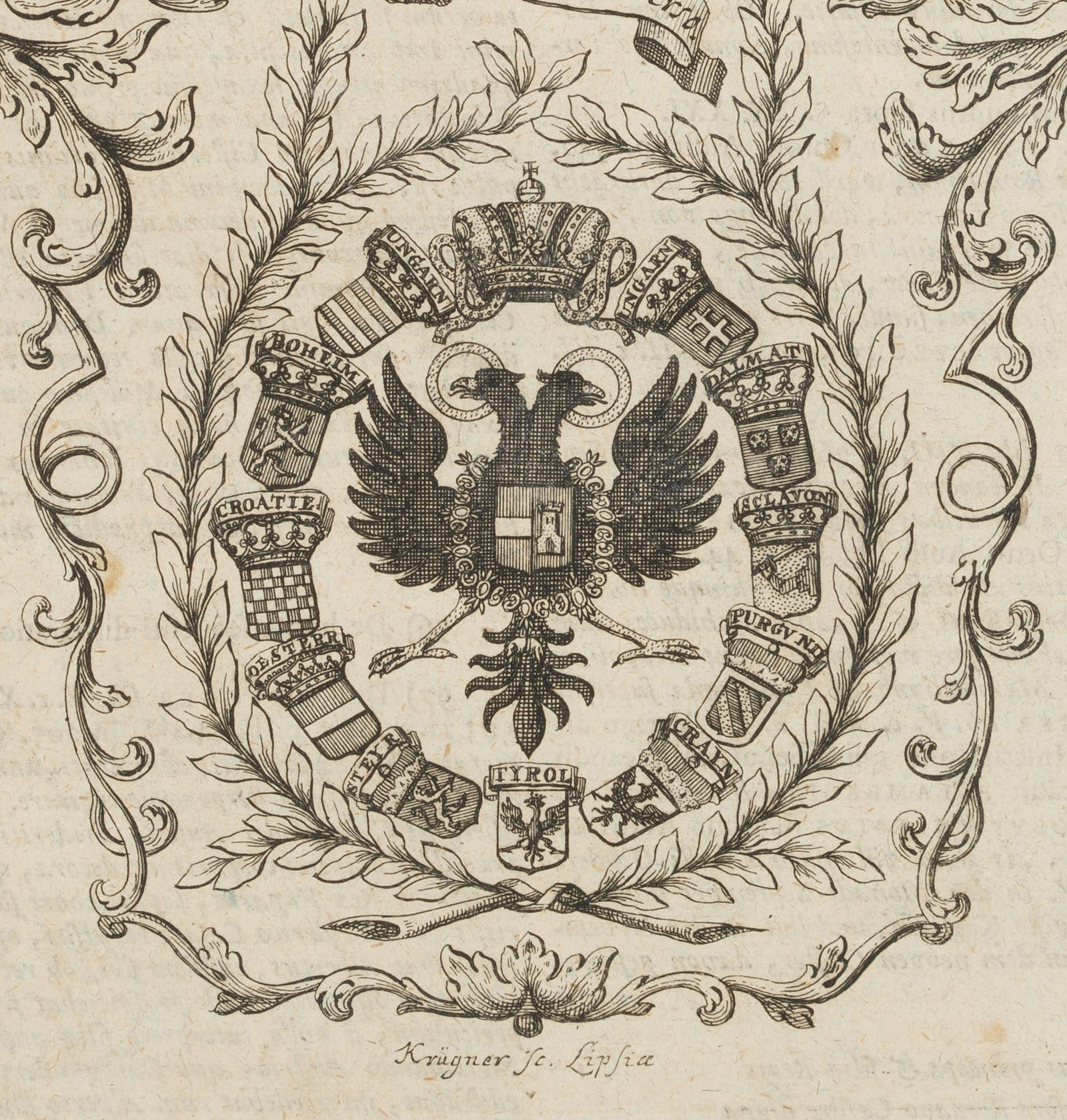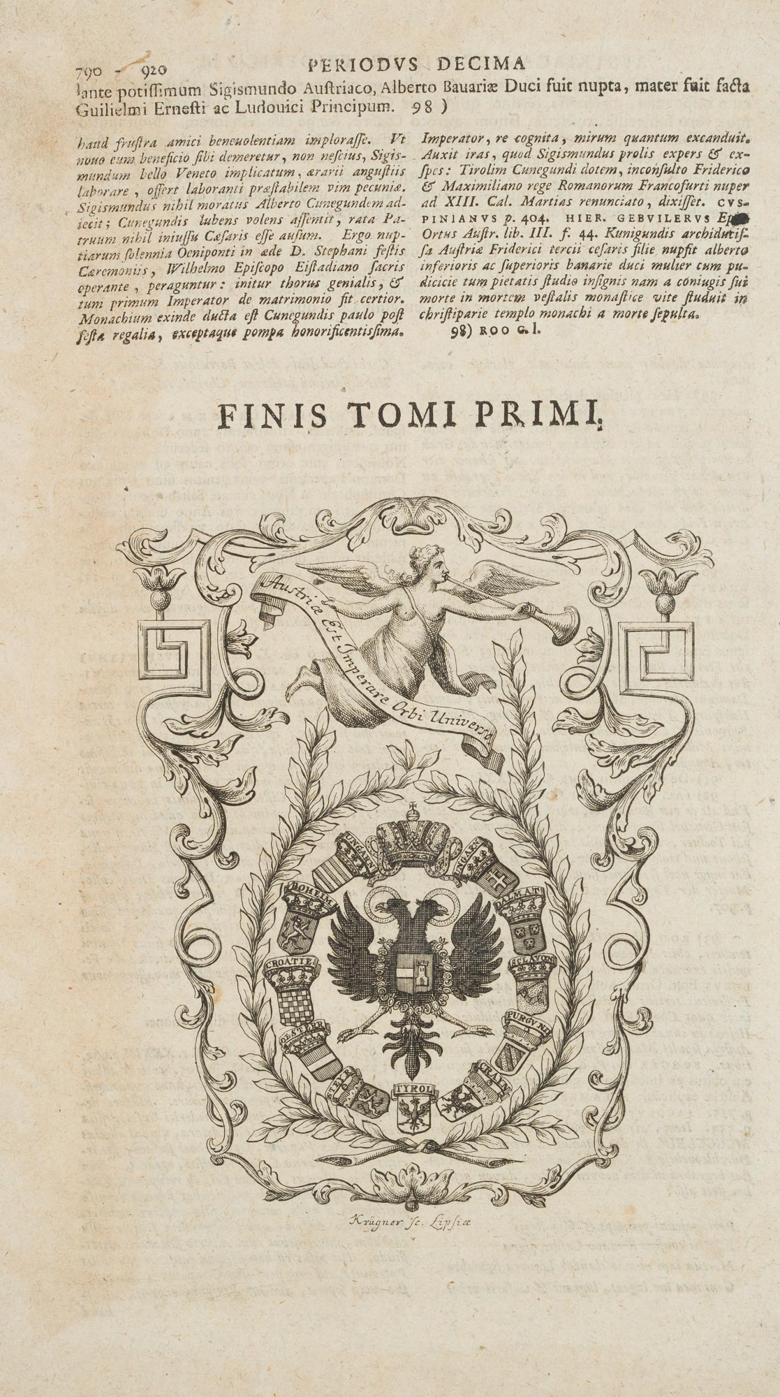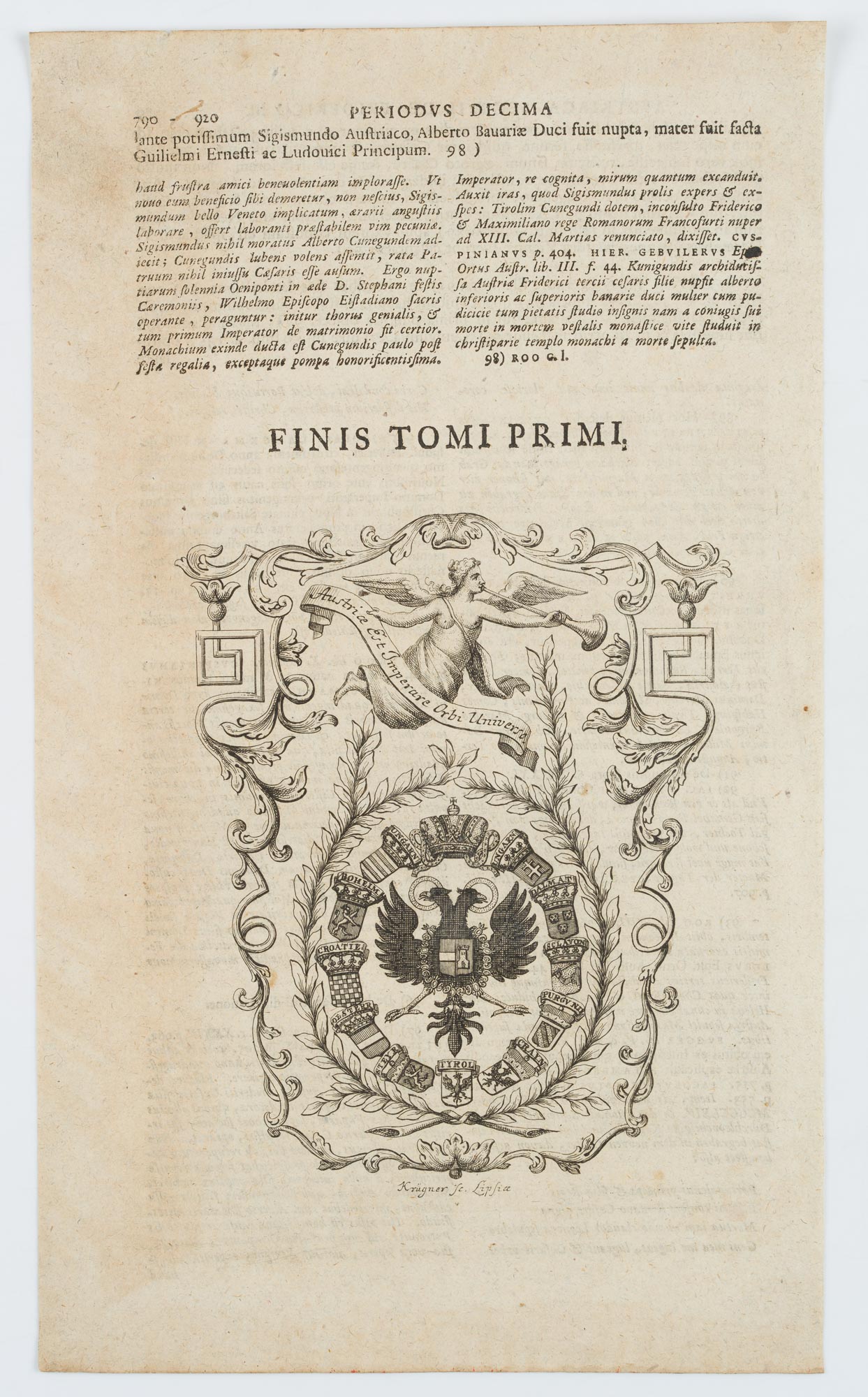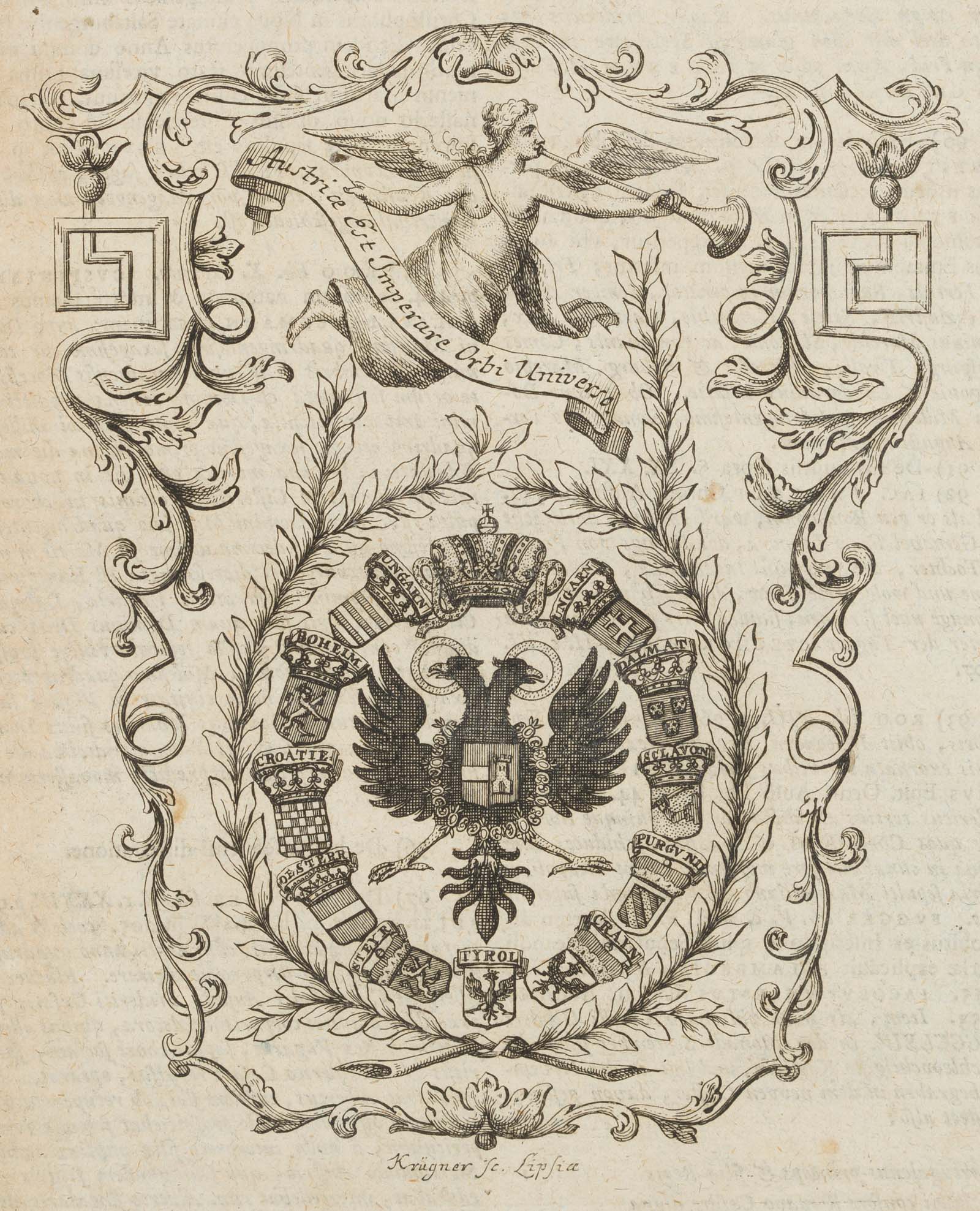 Blatt mit Textvignette aus Struves berühmten ‘Corpus Historiae Germanicae’. Vignette mit Textbanderole ‘Austriae est imperare orbi universo’. Burkhard Gotthelf Struve (1671 Weimar – 1738 Jena) war ein deutscher Polyhistor und Bibliothekar.