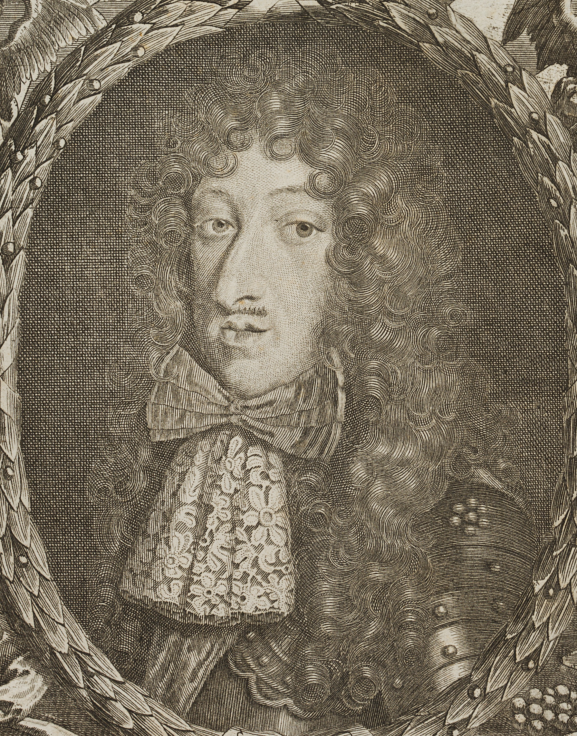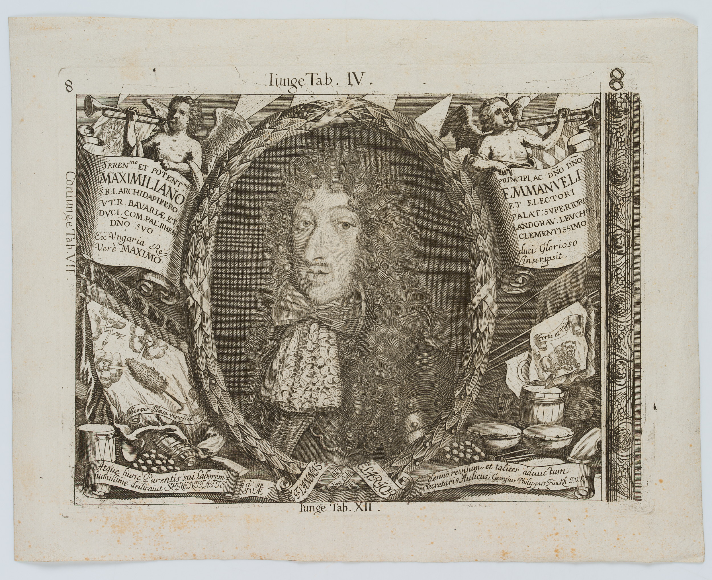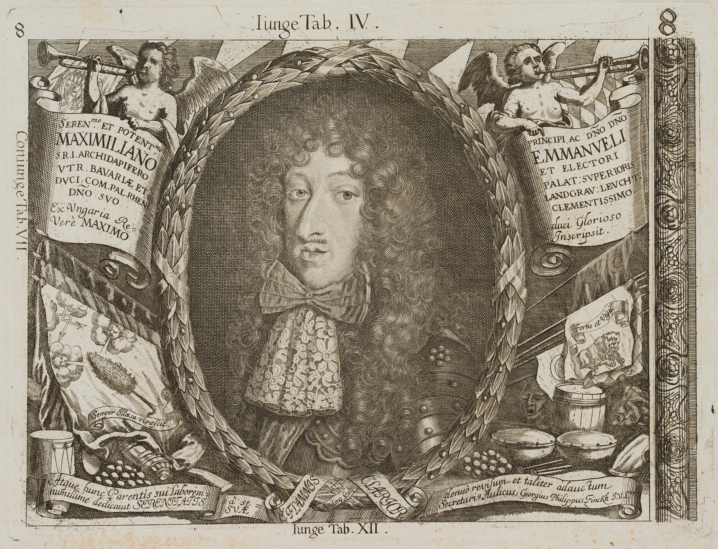 - Description: Bust portrait of the still young Elector Max Emanuel of Bavaria, framed by victory signs, arms and flags.