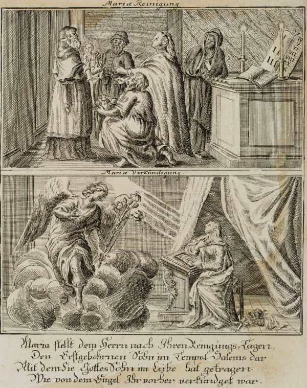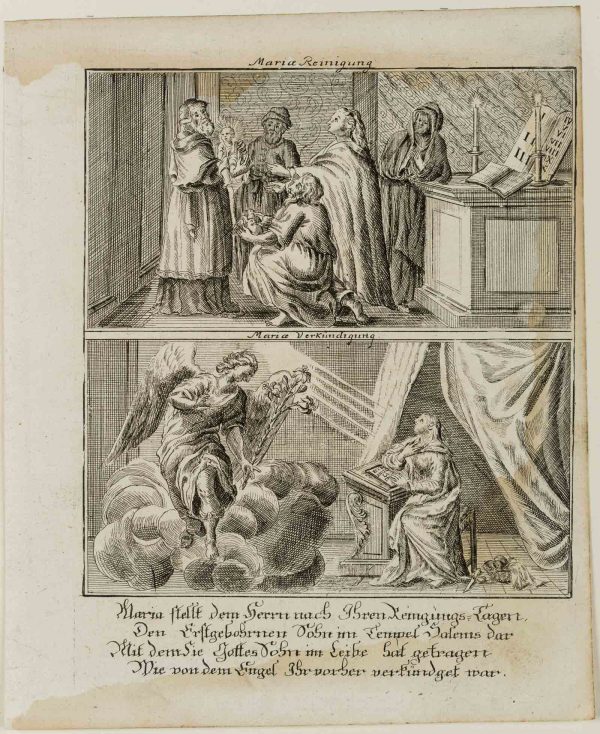 Unbekannt (18. Jahrhundert), Bibelillustration. Mariä Reinigung und Verkündigung des Herrn, um 1750, Kupferstich